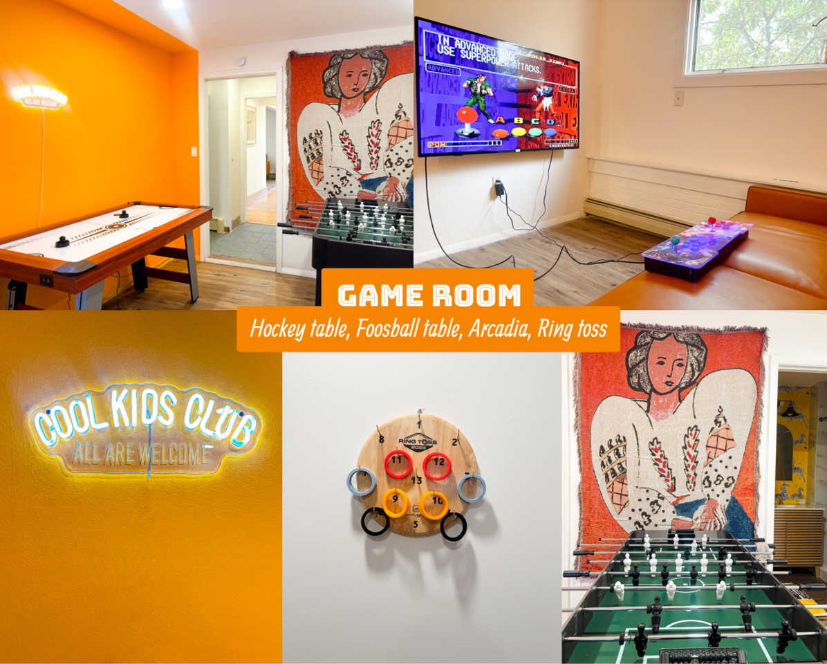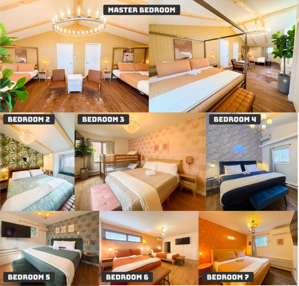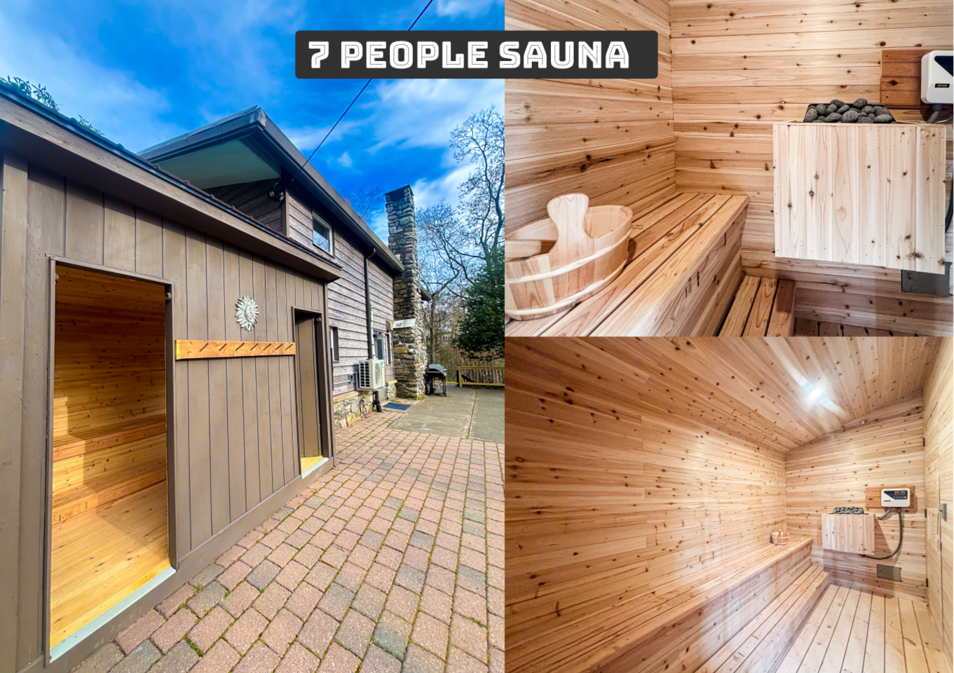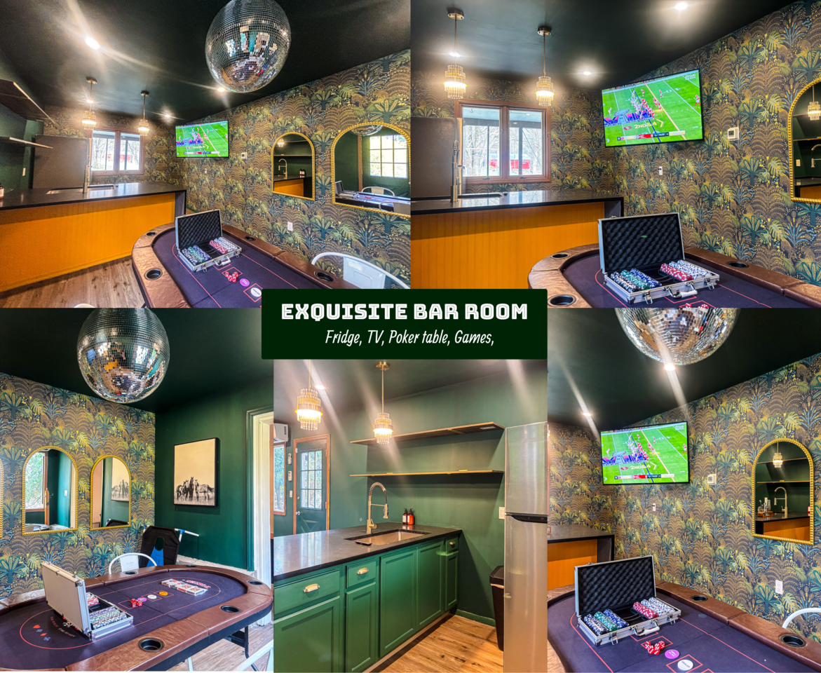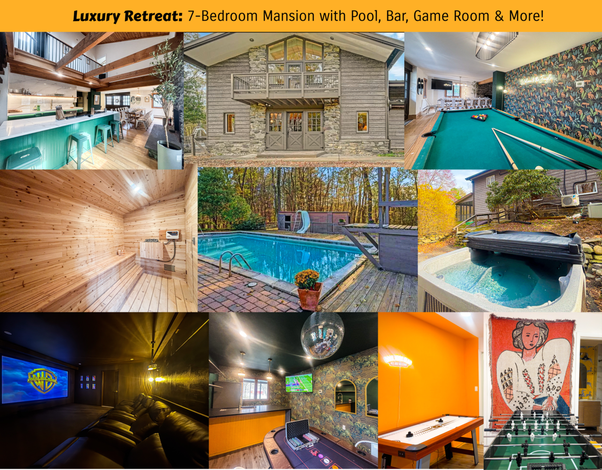 House details [In-ground swimming pool]: POOL IS CLOSED FOR THE SEASON. The outdoor private inground pool measures 20x40 feet and ranges from 3 to 6 feet in depth, offering a perfect space for relaxation and aquatic enjoyment. *Please note it's unheated. The pool will be open between late May to late September. Each year might be slightly different according to the weather. [7 people Sauna]: The sauna, enveloping up to 7 people, is luxuriously enveloped in freshly installed cedar wood paneling and features a powerful 5kW sauna heater, inviting guests to indulge in a relaxing and rejuvenating sweating session. [6 people Hot tub]: The hot tub, featuring 29 jets, provides guests with a comfortable and soothing experience while enjoying the serene view of the surrounding woodlands. [Elevator]: We've installed an elevator connecting the basement to the second floor, ensuring that individuals with disabilities can easily access and enjoy every part of the house. [Pool Table room]: The pool table room boasts a well-decorated ambiance centered around a full-size pool table, offering a sophisticated setting for enjoyable gameplay. It's a refined space tailored for those seeking leisure and social gatherings. [Game room]: The games room is equipped with a foosball table, air hockey, hockey and ring toss games, and a 55-inch TV featuring an arcade game console boasting over 10,000 games. It's a haven for entertainment enthusiasts with a variety of classic and modern gaming options. [Bar room]: The bar room features a beautifully decorated ambiance with a 6-foot-long black quartz countertop, accompanied by bar stools and an oversized sink. Equipped with a 60-inch TV, it accommodates up to 8 people for gambling while enjoying cocktails and watching TV simultaneously. [Movie theater] situated on the basement level, boasts a 120" screen, HD projector, and a professional speaker system, creating an immersive entertainment experience. With five luxurious reclining seats, it's the perfect space for enjoying movies or singing karaoke with friends and family. [Kitchen] is fully stocked for all cooking needs. We offer pots, pans, mixing bowls, cutting board, plates, cutlery and various glasses. Small appliances available are toaster, coffee maker, electric kettle, blender [Dining room] Seats 20 people. Has 60" smart TV. Gas fireplace would add cozy feeling to your evening [Family room]: The family room is furnished with a large leather sectional sofa, a coach, two armchairs, and an inviting egg hanging chair around a coffee table. A focal point is the spacious 75" HD smart TV, complete with party games, perfect for entertaining large groups. [Laundry room]: Contains of 2 washers and 2 dryers [Bedroom] 1st floor Bedroom 1 [1 King bed] Bedroom 2 [1 King bed] 2nd floor Bedroom 3 [2 King beds] Bedroom 4 [1 King bed] Bedroom 5 [1 King bed] Bedroom 6 [1 Queen bed + 1 bunk bed] Bedroom 7 [2 Queen beds] [Bathroom:] 1st floor Bathroom 1: Half bath Bathroom 2: Full bath Unattached to bedroom 2nd floor Bathroom 3: Full bath Unattached to bedroom Bathroom 4: In-suit full bath (attached to bedroom 3) Bathroom 5: In-suit full bath (attached to bedroom 7)