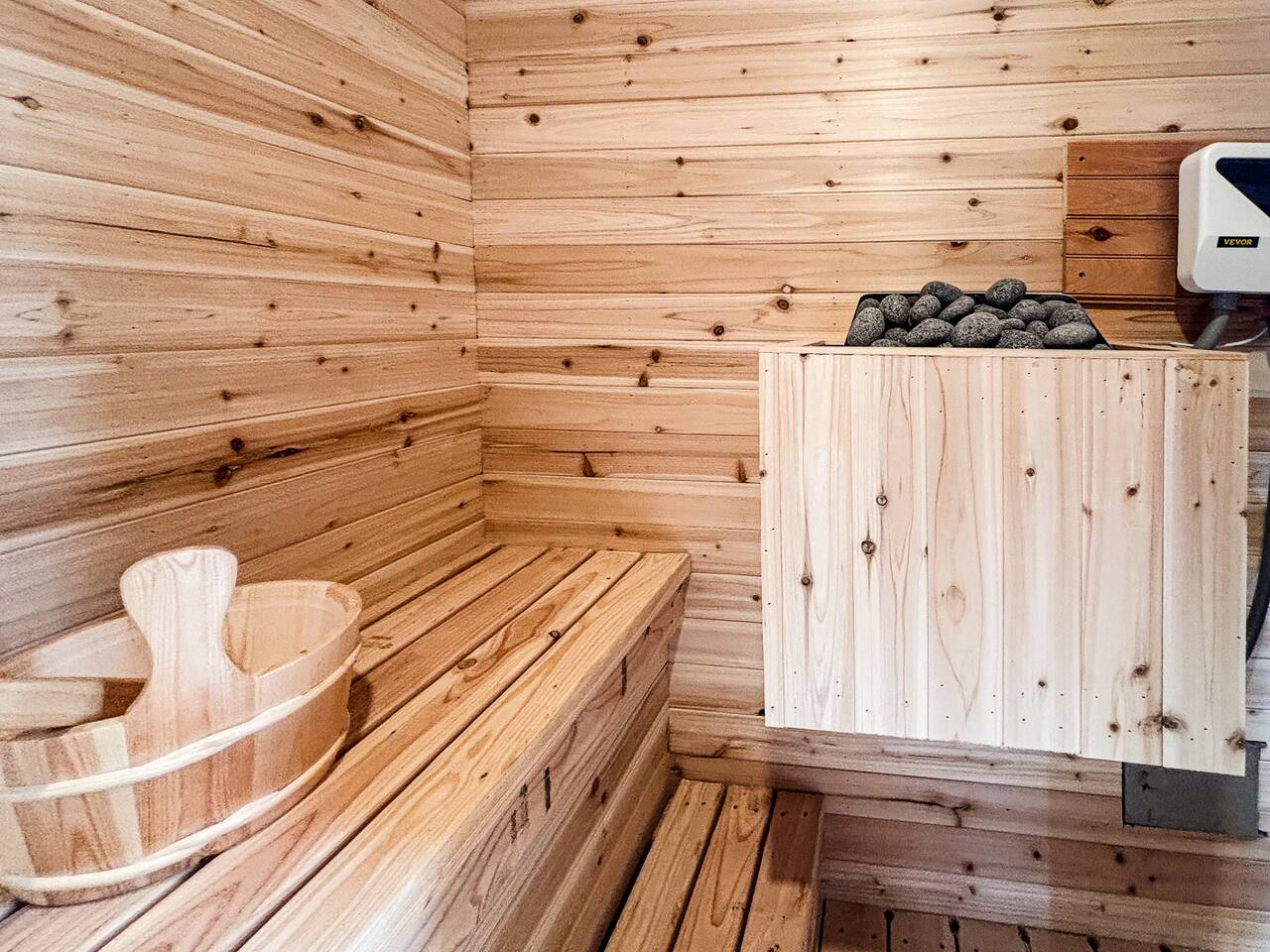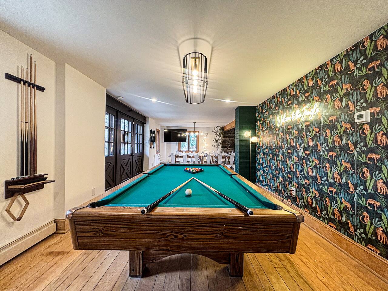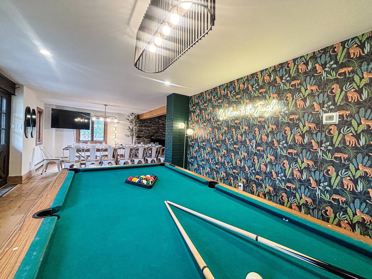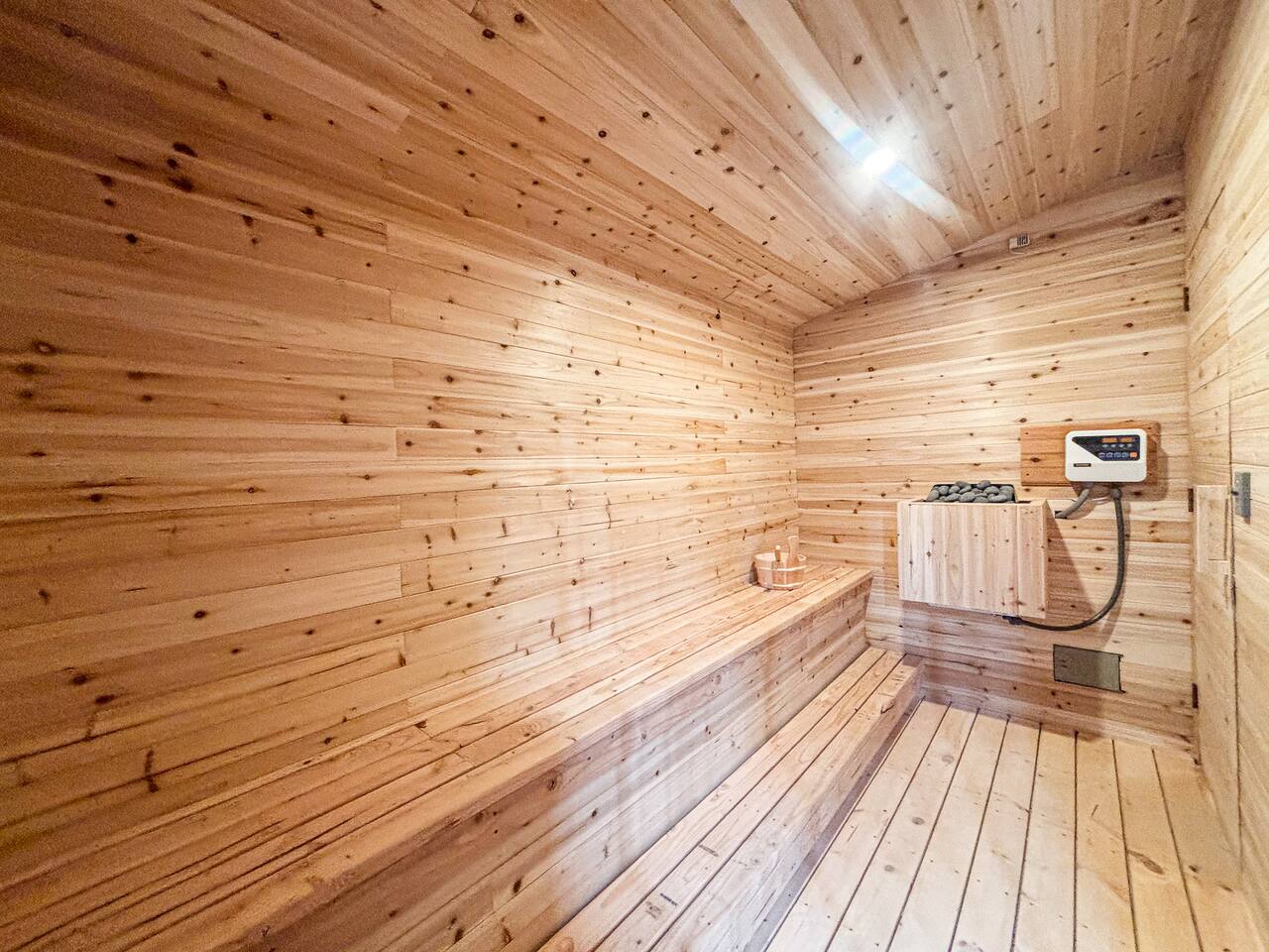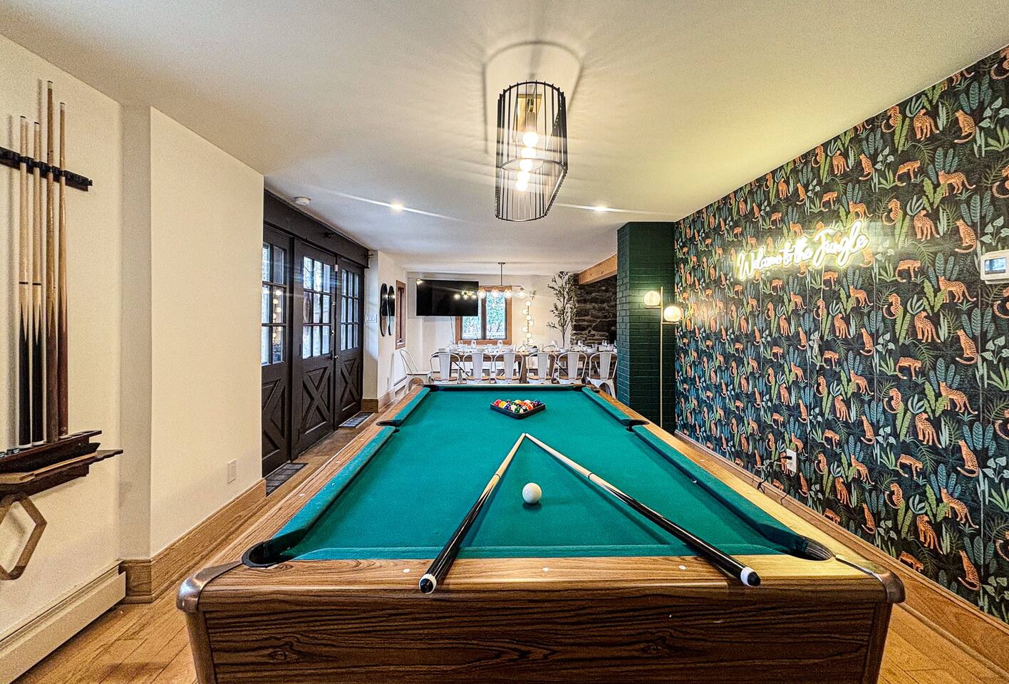 House details [In-ground swimming pool]: POOL IS CLOSED FOR THE SEASON. The outdoor private inground pool measures 20x40 feet and ranges from 3 to 6 feet in depth, offering a perfect space for relaxation and aquatic enjoyment. *Please note it's unheated. The pool will be open between late May to late September. Each year might be slightly different according to the weather. [7 people Sauna]: The sauna, enveloping up to 7 people, is luxuriously enveloped in freshly installed cedar wood paneling and features a powerful 5kW sauna heater, inviting guests to indulge in a relaxing and rejuvenating sweating session. [6 people Hot tub]: The hot tub, featuring 29 jets, provides guests with a comfortable and soothing experience while enjoying the serene view of the surrounding woodlands. [Elevator]: We've installed an elevator connecting the basement to the second floor, ensuring that individuals with disabilities can easily access and enjoy every part of the house. [Pool Table room]: The pool table room boasts a well-decorated ambiance centered around a full-size pool table, offering a sophisticated setting for enjoyable gameplay. It's a refined space tailored for those seeking leisure and social gatherings. [Game room]: The games room is equipped with a foosball table, air hockey, hockey and ring toss games, and a 55-inch TV featuring an arcade game console boasting over 10,000 games. It's a haven for entertainment enthusiasts with a variety of classic and modern gaming options. [Bar room]: The bar room features a beautifully decorated ambiance with a 6-foot-long black quartz countertop, accompanied by bar stools and an oversized sink. Equipped with a 60-inch TV, it accommodates up to 8 people for gambling while enjoying cocktails and watching TV simultaneously. [Movie theater] situated on the basement level, boasts a 120" screen, HD projector, and a professional speaker system, creating an immersive entertainment experience. With five luxurious reclining seats, it's the perfect space for enjoying movies or singing karaoke with friends and family. [Kitchen] is fully stocked for all cooking needs. We offer pots, pans, mixing bowls, cutting board, plates, cutlery and various glasses. Small appliances available are toaster, coffee maker, electric kettle, blender [Dining room] Seats 20 people. Has 60" smart TV. Gas fireplace would add cozy feeling to your evening [Family room]: The family room is furnished with a large leather sectional sofa, a coach, two armchairs, and an inviting egg hanging chair around a coffee table. A focal point is the spacious 75" HD smart TV, complete with party games, perfect for entertaining large groups. [Laundry room]: Contains of 2 washers and 2 dryers [Bedroom] 1st floor Bedroom 1 [1 King bed] Bedroom 2 [1 King bed] 2nd floor Bedroom 3 [2 King beds] Bedroom 4 [1 King bed] Bedroom 5 [1 King bed] Bedroom 6 [1 Queen bed + 1 bunk bed] Bedroom 7 [2 Queen beds] [Bathroom:] 1st floor Bathroom 1: Half bath Bathroom 2: Full bath Unattached to bedroom 2nd floor Bathroom 3: Full bath Unattached to bedroom Bathroom 4: In-suit full bath (attached to bedroom 3) Bathroom 5: In-suit full bath (attached to bedroom 7)