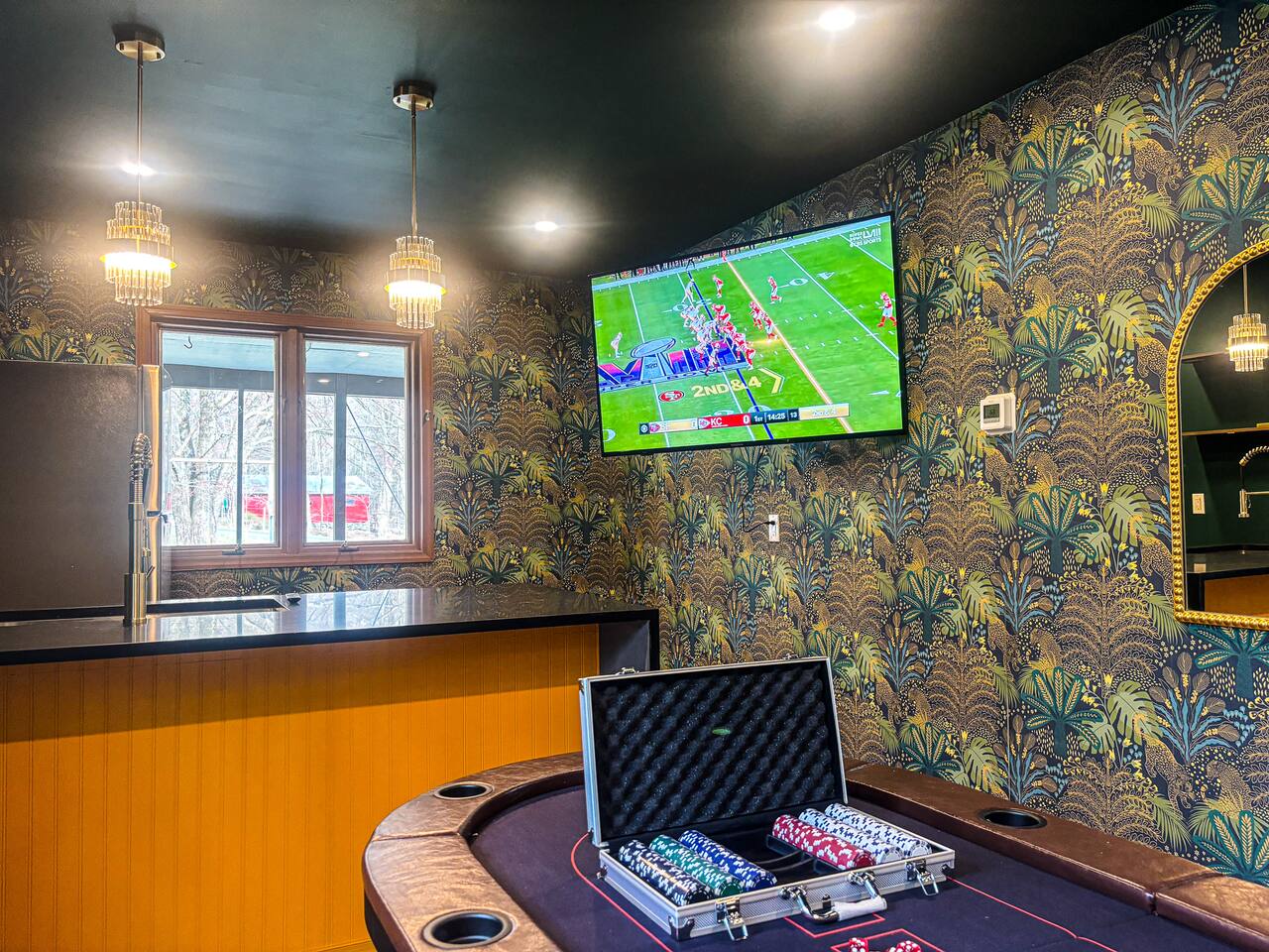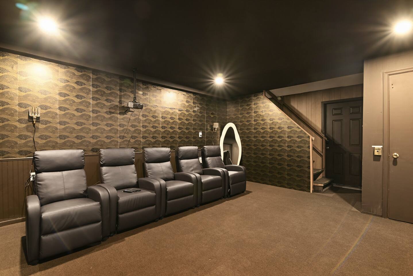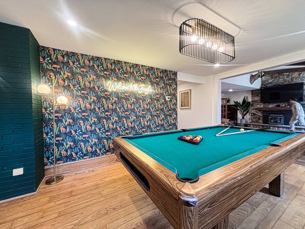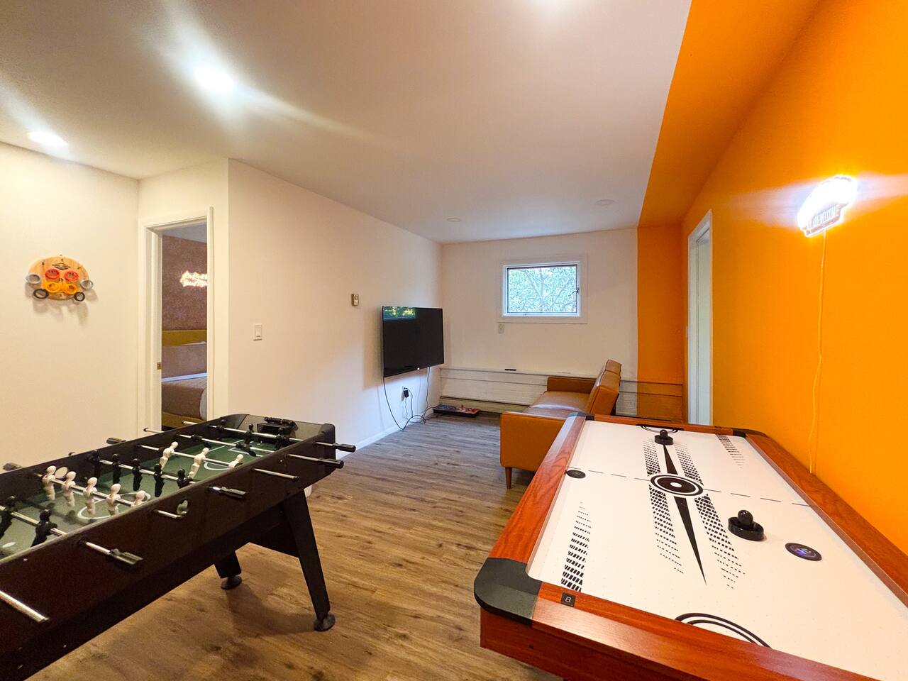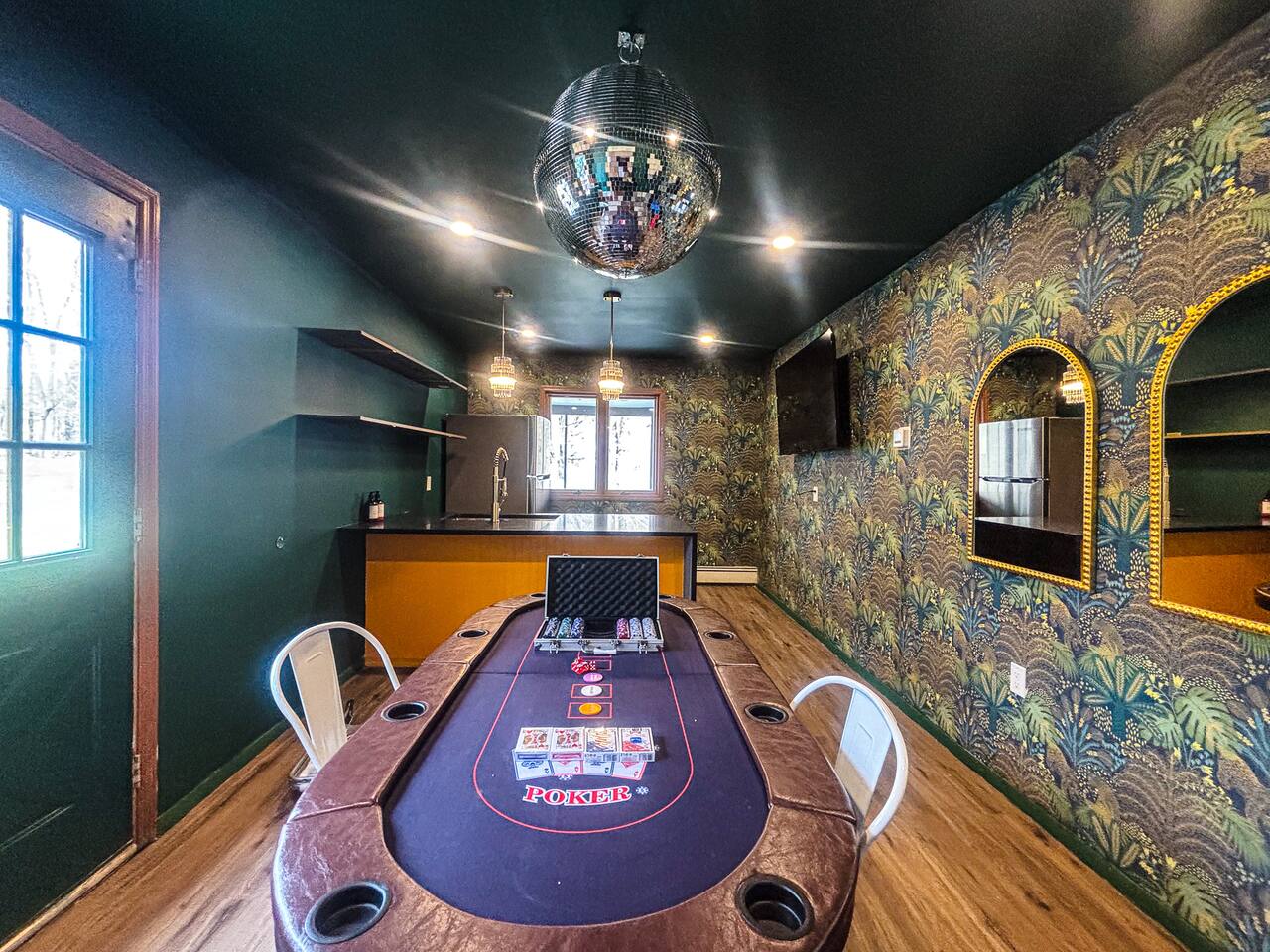 House details [In-ground swimming pool]: POOL IS CLOSED FOR THE SEASON. The outdoor private inground pool measures 20x40 feet and ranges from 3 to 6 feet in depth, offering a perfect space for relaxation and aquatic enjoyment. *Please note it's unheated. The pool will be open between late May to late September. Each year might be slightly different according to the weather. [7 people Sauna]: The sauna, enveloping up to 7 people, is luxuriously enveloped in freshly installed cedar wood paneling and features a powerful 5kW sauna heater, inviting guests to indulge in a relaxing and rejuvenating sweating session. [6 people Hot tub]: The hot tub, featuring 29 jets, provides guests with a comfortable and soothing experience while enjoying the serene view of the surrounding woodlands. [Elevator]: We've installed an elevator connecting the basement to the second floor, ensuring that individuals with disabilities can easily access and enjoy every part of the house. [Pool Table room]: The pool table room boasts a well-decorated ambiance centered around a full-size pool table, offering a sophisticated setting for enjoyable gameplay. It's a refined space tailored for those seeking leisure and social gatherings. [Game room]: The games room is equipped with a foosball table, air hockey, hockey and ring toss games, and a 55-inch TV featuring an arcade game console boasting over 10,000 games. It's a haven for entertainment enthusiasts with a variety of classic and modern gaming options. [Bar room]: The bar room features a beautifully decorated ambiance with a 6-foot-long black quartz countertop, accompanied by bar stools and an oversized sink. Equipped with a 60-inch TV, it accommodates up to 8 people for gambling while enjoying cocktails and watching TV simultaneously. [Movie theater] situated on the basement level, boasts a 120" screen, HD projector, and a professional speaker system, creating an immersive entertainment experience. With five luxurious reclining seats, it's the perfect space for enjoying movies or singing karaoke with friends and family. [Kitchen] is fully stocked for all cooking needs. We offer pots, pans, mixing bowls, cutting board, plates, cutlery and various glasses. Small appliances available are toaster, coffee maker, electric kettle, blender [Dining room] Seats 20 people. Has 60" smart TV. Gas fireplace would add cozy feeling to your evening [Family room]: The family room is furnished with a large leather sectional sofa, a coach, two armchairs, and an inviting egg hanging chair around a coffee table. A focal point is the spacious 75" HD smart TV, complete with party games, perfect for entertaining large groups. [Laundry room]: Contains of 2 washers and 2 dryers [Bedroom] 1st floor Bedroom 1 [1 King bed] Bedroom 2 [1 King bed] 2nd floor Bedroom 3 [2 King beds] Bedroom 4 [1 King bed] Bedroom 5 [1 King bed] Bedroom 6 [1 Queen bed + 1 bunk bed] Bedroom 7 [2 Queen beds] [Bathroom:] 1st floor Bathroom 1: Half bath Bathroom 2: Full bath Unattached to bedroom 2nd floor Bathroom 3: Full bath Unattached to bedroom Bathroom 4: In-suit full bath (attached to bedroom 3) Bathroom 5: In-suit full bath (attached to bedroom 7)