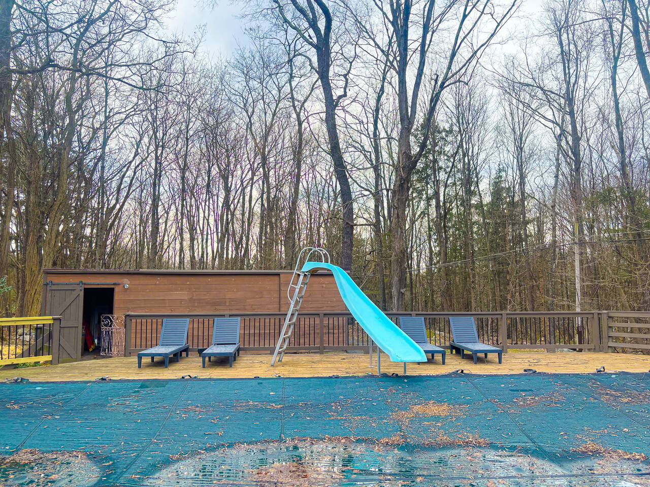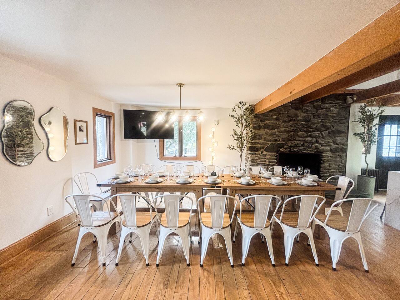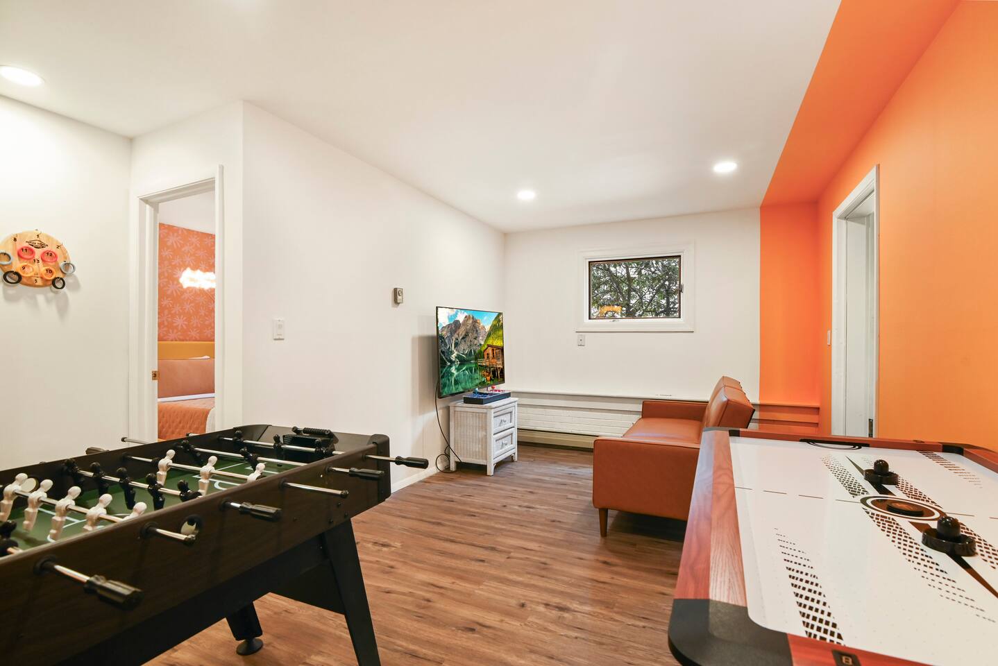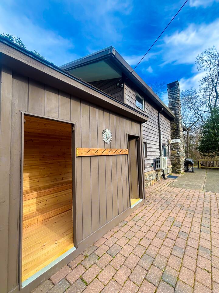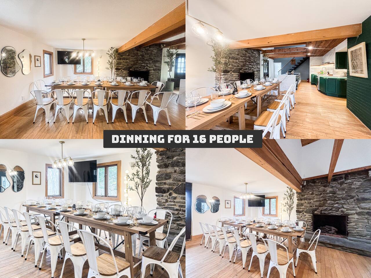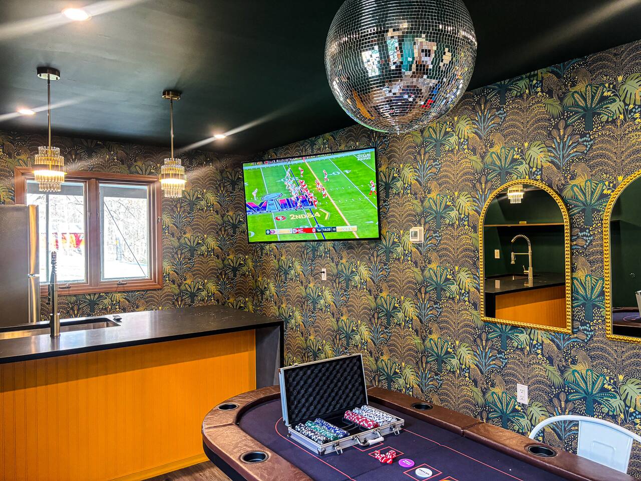House details [In-ground swimming pool]: POOL IS CLOSED FOR THE SEASON. The outdoor private inground pool measures 20x40 feet and ranges from 3 to 6 feet in depth, offering a perfect space for relaxation and aquatic enjoyment. *Please note it's unheated. The pool will be open between late May to late September. Each year might be slightly different according to the weather. [7 people Sauna]: The sauna, enveloping up to 7 people, is luxuriously enveloped in freshly installed cedar wood paneling and features a powerful 5kW sauna heater, inviting guests to indulge in a relaxing and rejuvenating sweating session. [6 people Hot tub]: The hot tub, featuring 29 jets, provides guests with a comfortable and soothing experience while enjoying the serene view of the surrounding woodlands. [Elevator]: We've installed an elevator connecting the basement to the second floor, ensuring that individuals with disabilities can easily access and enjoy every part of the house. [Pool Table room]: The pool table room boasts a well-decorated ambiance centered around a full-size pool table, offering a sophisticated setting for enjoyable gameplay. It's a refined space tailored for those seeking leisure and social gatherings. [Game room]: The games room is equipped with a foosball table, air hockey, hockey and ring toss games, and a 55-inch TV featuring an arcade game console boasting over 10,000 games. It's a haven for entertainment enthusiasts with a variety of classic and modern gaming options. [Bar room]: The bar room features a beautifully decorated ambiance with a 6-foot-long black quartz countertop, accompanied by bar stools and an oversized sink. Equipped with a 60-inch TV, it accommodates up to 8 people for gambling while enjoying cocktails and watching TV simultaneously. [Movie theater] situated on the basement level, boasts a 120" screen, HD projector, and a professional speaker system, creating an immersive entertainment experience. With five luxurious reclining seats, it's the perfect space for enjoying movies or singing karaoke with friends and family. [Kitchen] is fully stocked for all cooking needs. We offer pots, pans, mixing bowls, cutting board, plates, cutlery and various glasses. Small appliances available are toaster, coffee maker, electric kettle, blender [Dining room] Seats 20 people. Has 60" smart TV. Gas fireplace would add cozy feeling to your evening [Family room]: The family room is furnished with a large leather sectional sofa, a coach, two armchairs, and an inviting egg hanging chair around a coffee table. A focal point is the spacious 75" HD smart TV, complete with party games, perfect for entertaining large groups. [Laundry room]: Contains of 2 washers and 2 dryers [Bedroom] 1st floor Bedroom 1 [1 King bed] Bedroom 2 [1 King bed] 2nd floor Bedroom 3 [2 King beds] Bedroom 4 [1 King bed] Bedroom 5 [1 King bed] Bedroom 6 [1 Queen bed + 1 bunk bed] Bedroom 7 [2 Queen beds] [Bathroom:] 1st floor Bathroom 1: Half bath Bathroom 2: Full bath Unattached to bedroom 2nd floor Bathroom 3: Full bath Unattached to bedroom Bathroom 4: In-suit full bath (attached to bedroom 3) Bathroom 5: In-suit full bath (attached to bedroom 7)