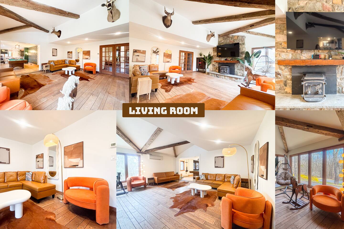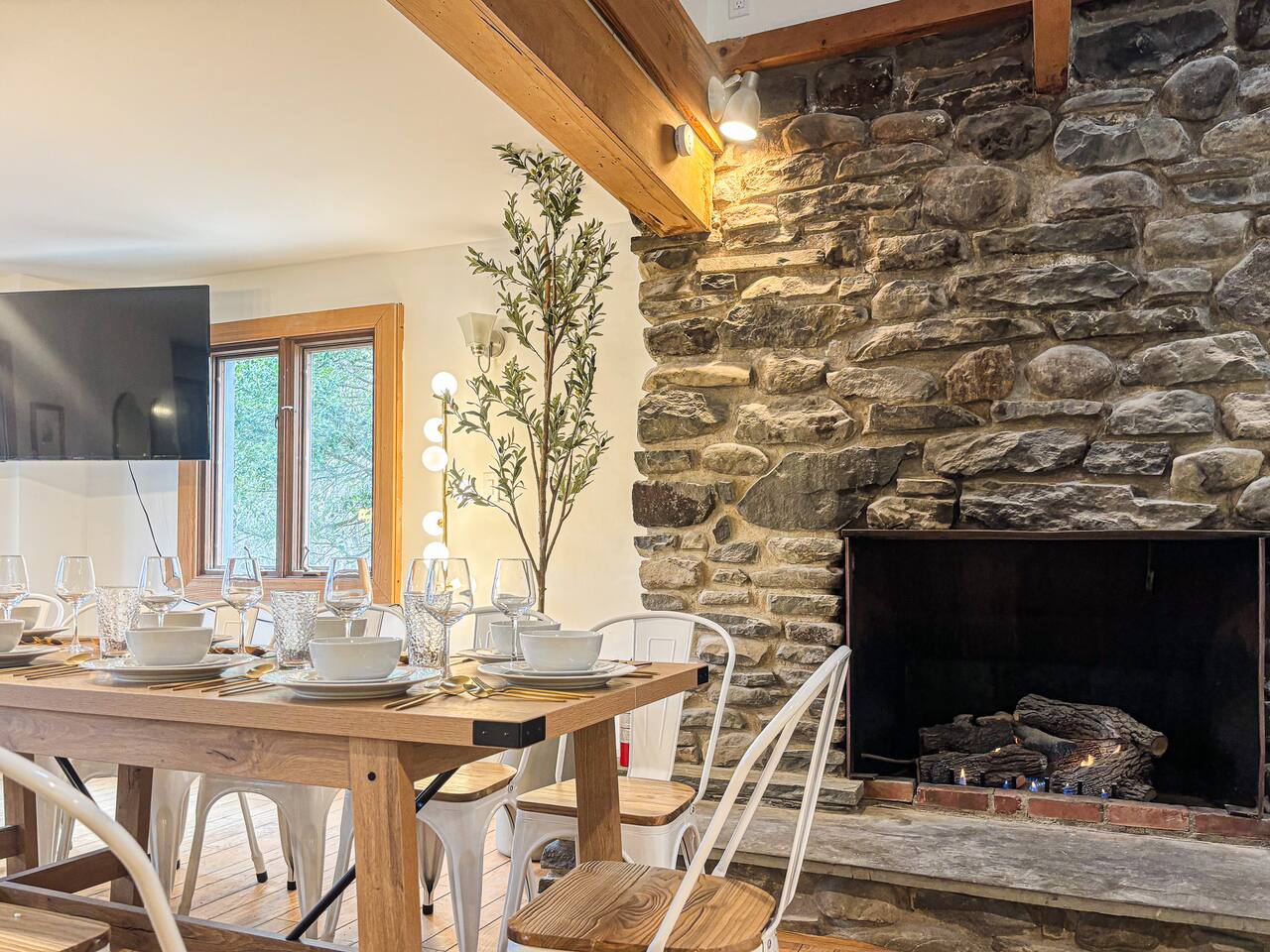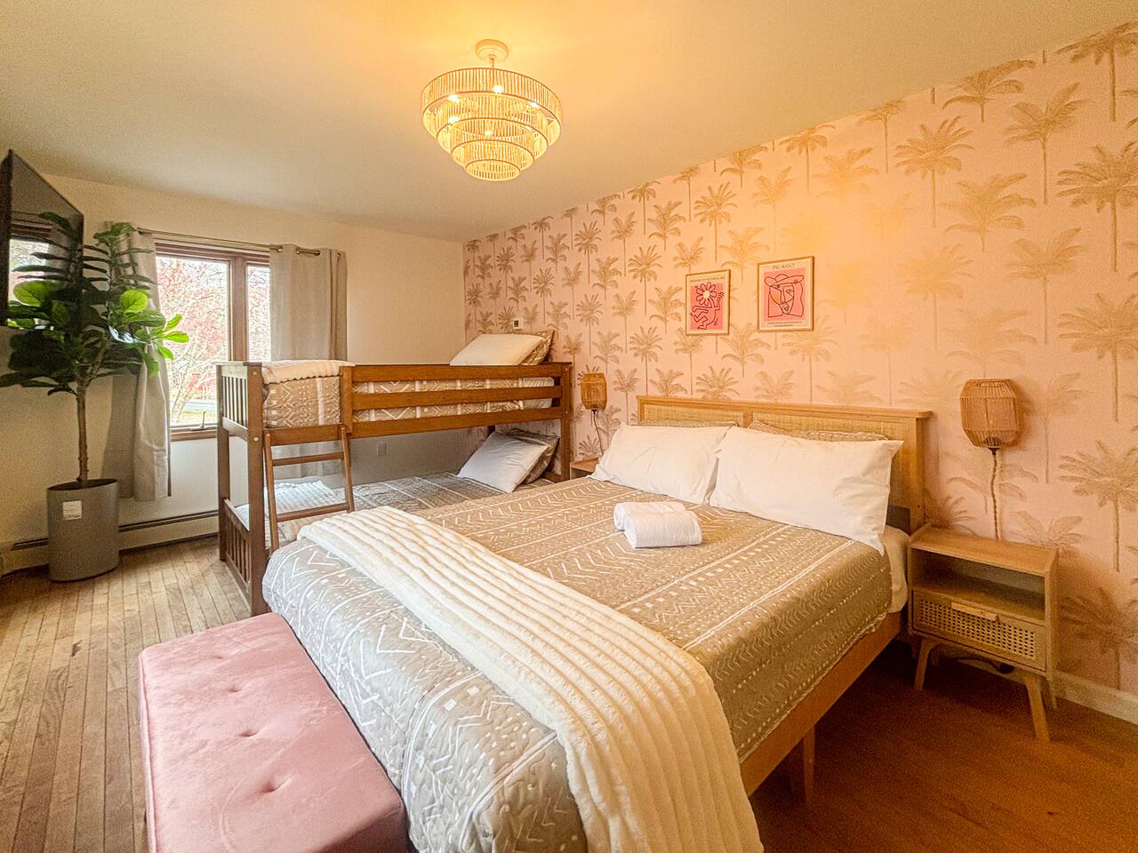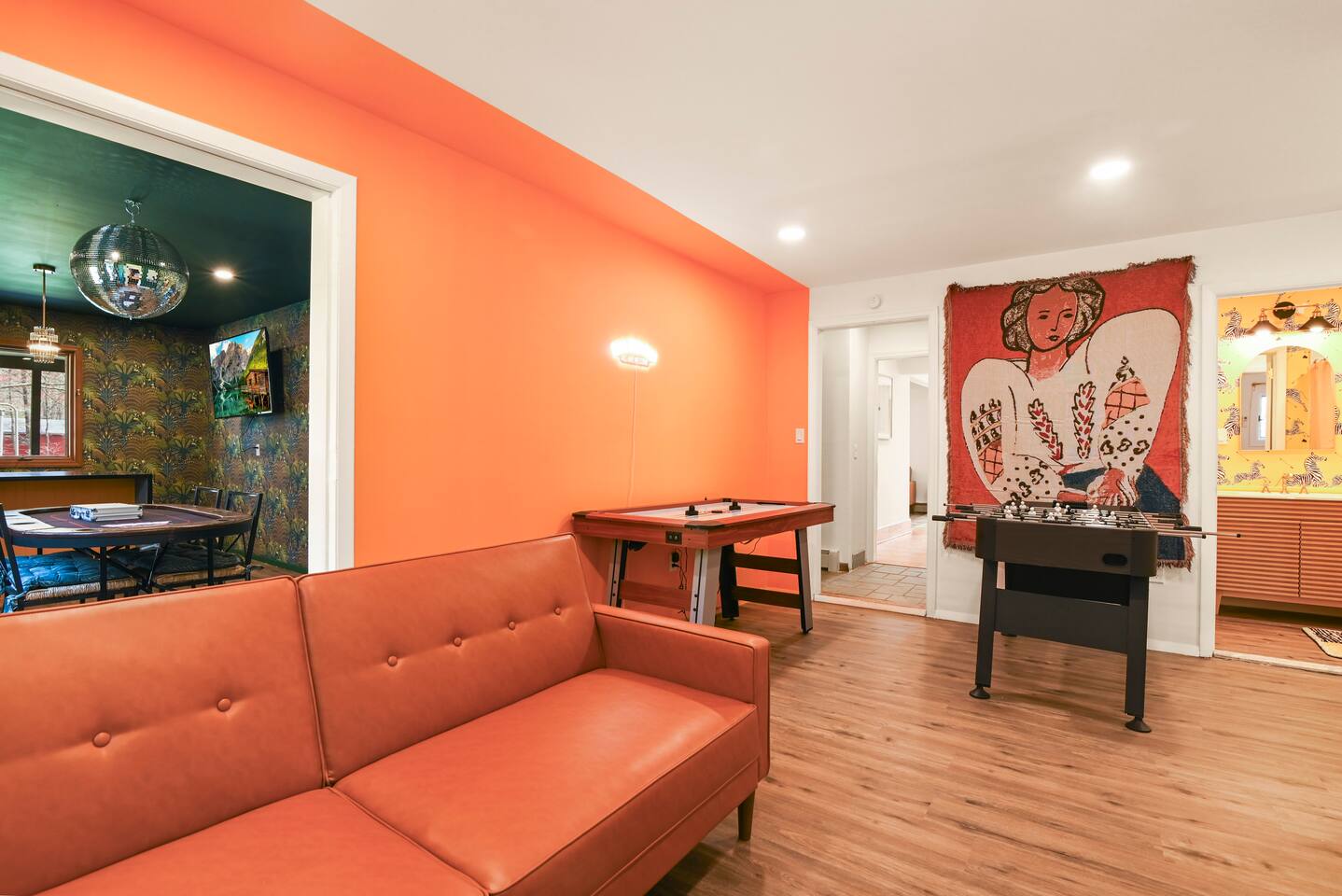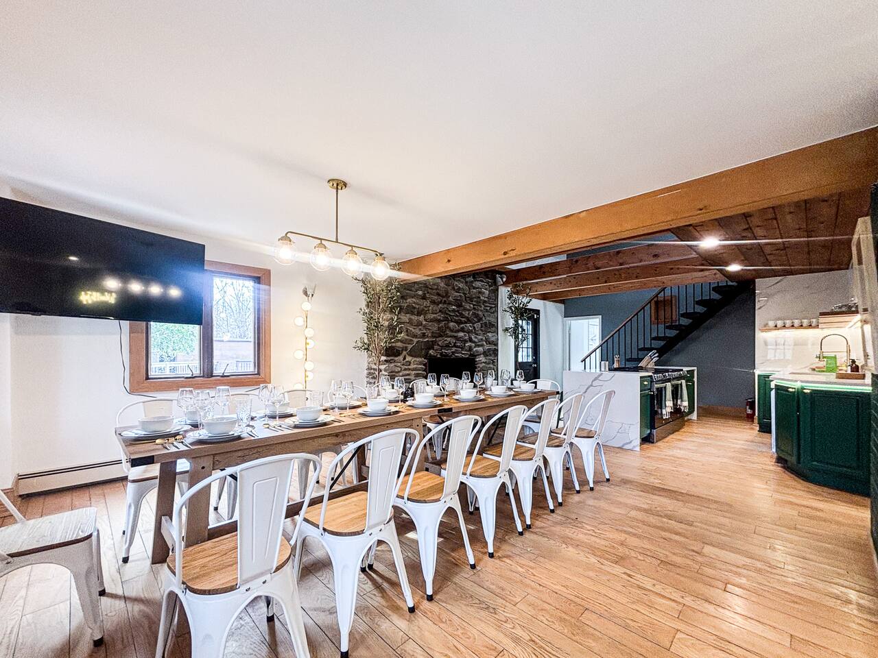 House details [In-ground swimming pool]: POOL IS CLOSED FOR THE SEASON. The outdoor private inground pool measures 20x40 feet and ranges from 3 to 6 feet in depth, offering a perfect space for relaxation and aquatic enjoyment. *Please note it's unheated. The pool will be open between late May to late September. Each year might be slightly different according to the weather. [7 people Sauna]: The sauna, enveloping up to 7 people, is luxuriously enveloped in freshly installed cedar wood paneling and features a powerful 5kW sauna heater, inviting guests to indulge in a relaxing and rejuvenating sweating session. [6 people Hot tub]: The hot tub, featuring 29 jets, provides guests with a comfortable and soothing experience while enjoying the serene view of the surrounding woodlands. [Elevator]: We've installed an elevator connecting the basement to the second floor, ensuring that individuals with disabilities can easily access and enjoy every part of the house. [Pool Table room]: The pool table room boasts a well-decorated ambiance centered around a full-size pool table, offering a sophisticated setting for enjoyable gameplay. It's a refined space tailored for those seeking leisure and social gatherings. [Game room]: The games room is equipped with a foosball table, air hockey, hockey and ring toss games, and a 55-inch TV featuring an arcade game console boasting over 10,000 games. It's a haven for entertainment enthusiasts with a variety of classic and modern gaming options. [Bar room]: The bar room features a beautifully decorated ambiance with a 6-foot-long black quartz countertop, accompanied by bar stools and an oversized sink. Equipped with a 60-inch TV, it accommodates up to 8 people for gambling while enjoying cocktails and watching TV simultaneously. [Movie theater] situated on the basement level, boasts a 120" screen, HD projector, and a professional speaker system, creating an immersive entertainment experience. With five luxurious reclining seats, it's the perfect space for enjoying movies or singing karaoke with friends and family. [Kitchen] is fully stocked for all cooking needs. We offer pots, pans, mixing bowls, cutting board, plates, cutlery and various glasses. Small appliances available are toaster, coffee maker, electric kettle, blender [Dining room] Seats 20 people. Has 60" smart TV. Gas fireplace would add cozy feeling to your evening [Family room]: The family room is furnished with a large leather sectional sofa, a coach, two armchairs, and an inviting egg hanging chair around a coffee table. A focal point is the spacious 75" HD smart TV, complete with party games, perfect for entertaining large groups. [Laundry room]: Contains of 2 washers and 2 dryers [Bedroom] 1st floor Bedroom 1 [1 King bed] Bedroom 2 [1 King bed] 2nd floor Bedroom 3 [2 King beds] Bedroom 4 [1 King bed] Bedroom 5 [1 King bed] Bedroom 6 [1 Queen bed + 1 bunk bed] Bedroom 7 [2 Queen beds] [Bathroom:] 1st floor Bathroom 1: Half bath Bathroom 2: Full bath Unattached to bedroom 2nd floor Bathroom 3: Full bath Unattached to bedroom Bathroom 4: In-suit full bath (attached to bedroom 3) Bathroom 5: In-suit full bath (attached to bedroom 7)