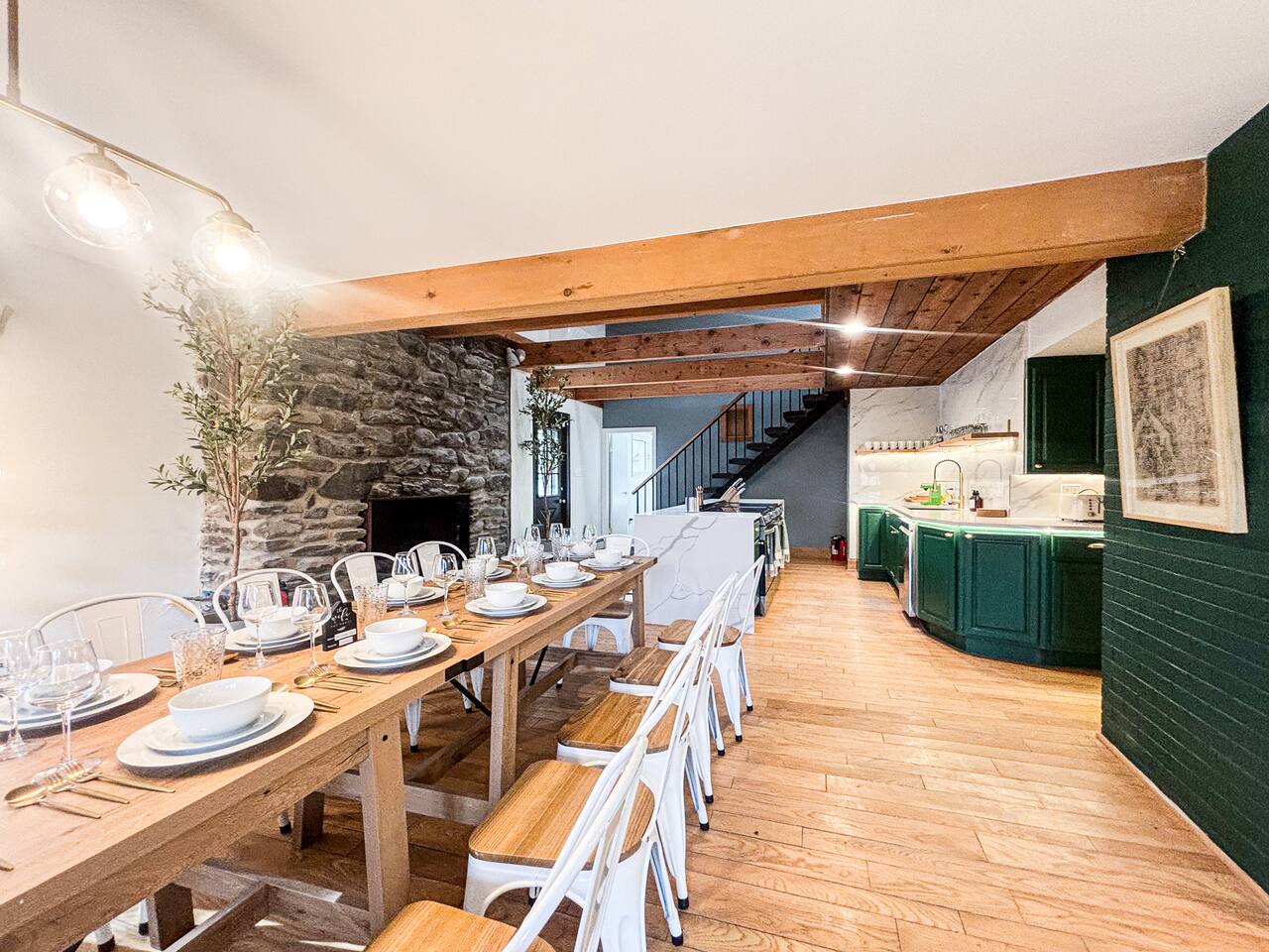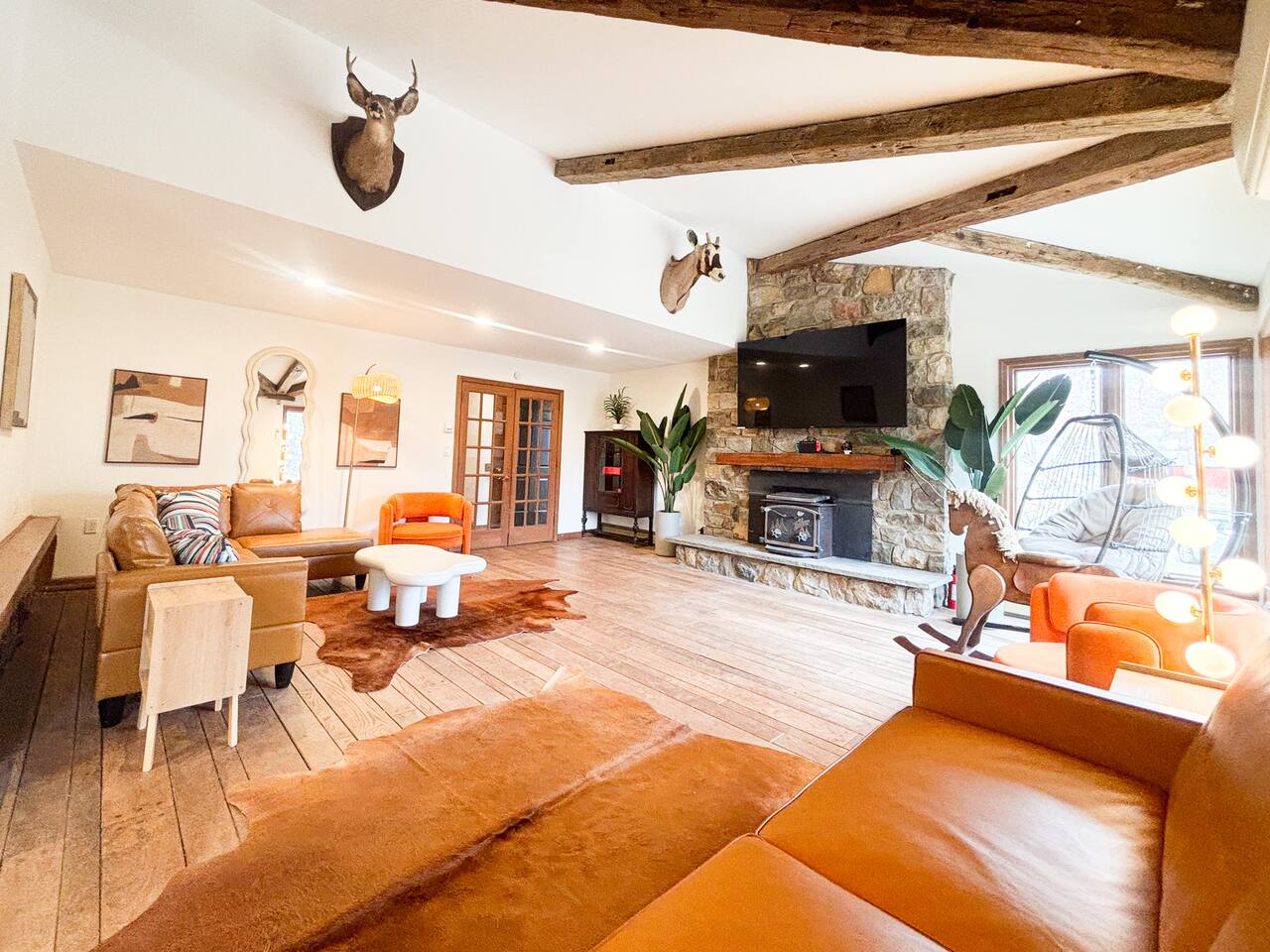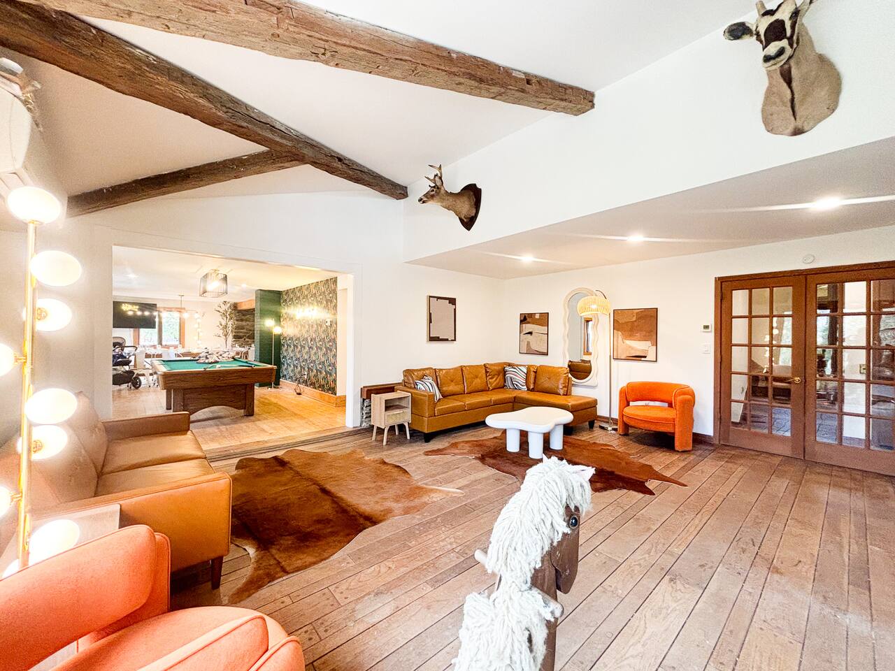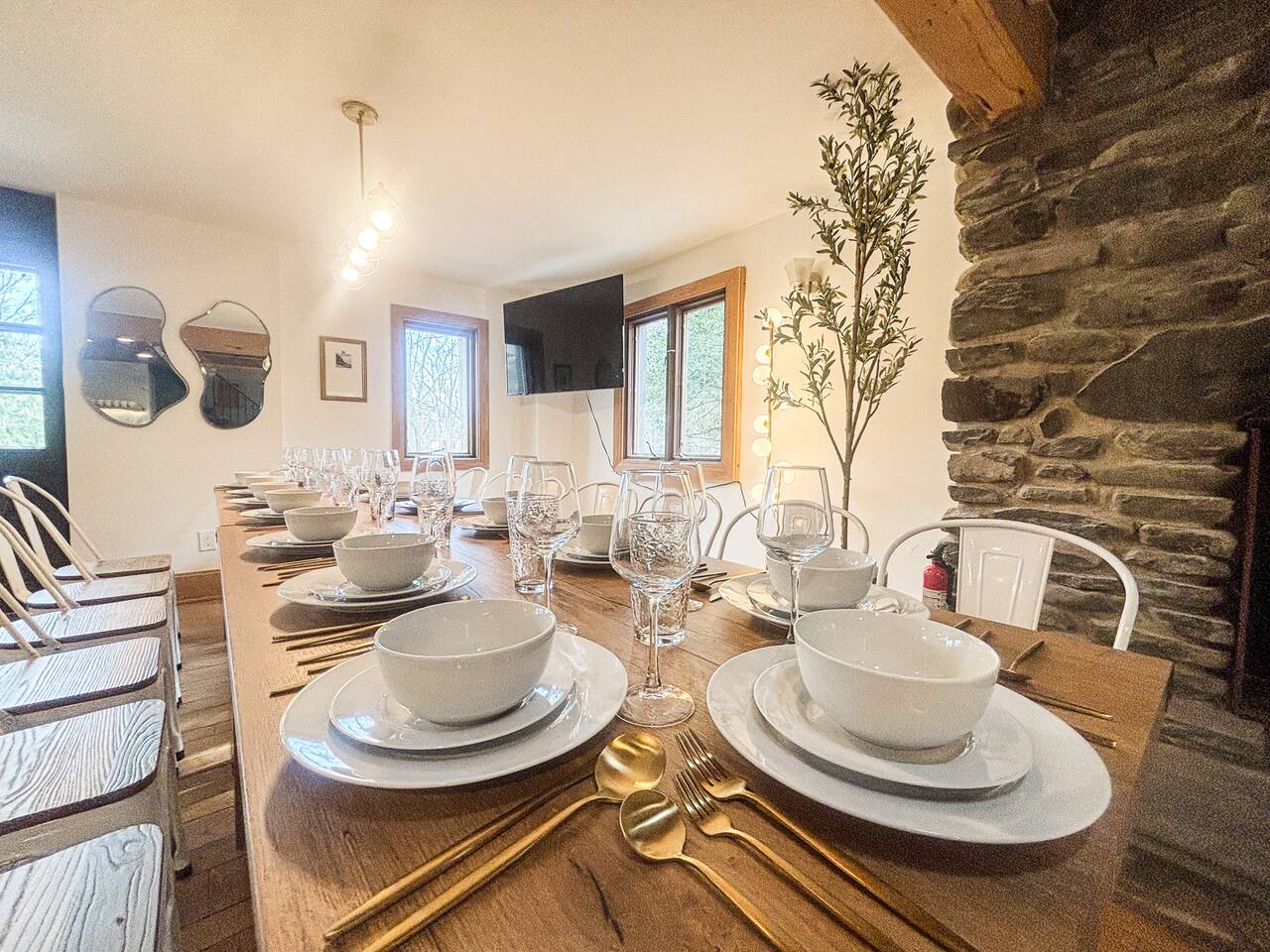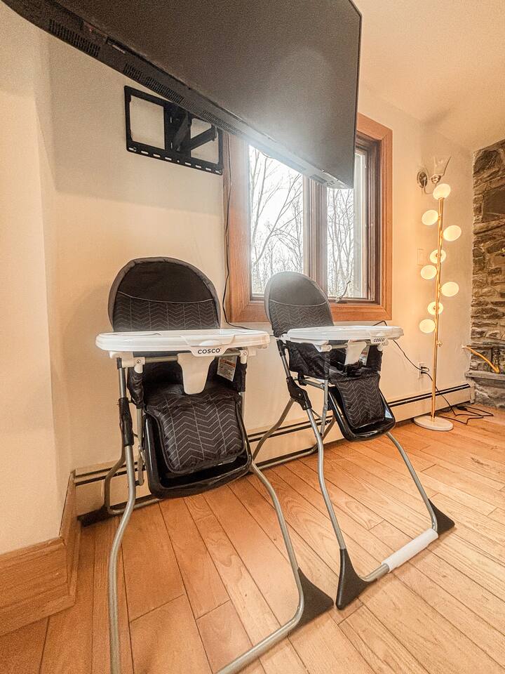 House details [In-ground swimming pool]: POOL IS CLOSED FOR THE SEASON. The outdoor private inground pool measures 20x40 feet and ranges from 3 to 6 feet in depth, offering a perfect space for relaxation and aquatic enjoyment. *Please note it's unheated. The pool will be open between late May to late September. Each year might be slightly different according to the weather. [7 people Sauna]: The sauna, enveloping up to 7 people, is luxuriously enveloped in freshly installed cedar wood paneling and features a powerful 5kW sauna heater, inviting guests to indulge in a relaxing and rejuvenating sweating session. [6 people Hot tub]: The hot tub, featuring 29 jets, provides guests with a comfortable and soothing experience while enjoying the serene view of the surrounding woodlands. [Elevator]: We've installed an elevator connecting the basement to the second floor, ensuring that individuals with disabilities can easily access and enjoy every part of the house. [Pool Table room]: The pool table room boasts a well-decorated ambiance centered around a full-size pool table, offering a sophisticated setting for enjoyable gameplay. It's a refined space tailored for those seeking leisure and social gatherings. [Game room]: The games room is equipped with a foosball table, air hockey, hockey and ring toss games, and a 55-inch TV featuring an arcade game console boasting over 10,000 games. It's a haven for entertainment enthusiasts with a variety of classic and modern gaming options. [Bar room]: The bar room features a beautifully decorated ambiance with a 6-foot-long black quartz countertop, accompanied by bar stools and an oversized sink. Equipped with a 60-inch TV, it accommodates up to 8 people for gambling while enjoying cocktails and watching TV simultaneously. [Movie theater] situated on the basement level, boasts a 120" screen, HD projector, and a professional speaker system, creating an immersive entertainment experience. With five luxurious reclining seats, it's the perfect space for enjoying movies or singing karaoke with friends and family. [Kitchen] is fully stocked for all cooking needs. We offer pots, pans, mixing bowls, cutting board, plates, cutlery and various glasses. Small appliances available are toaster, coffee maker, electric kettle, blender [Dining room] Seats 20 people. Has 60" smart TV. Gas fireplace would add cozy feeling to your evening [Family room]: The family room is furnished with a large leather sectional sofa, a coach, two armchairs, and an inviting egg hanging chair around a coffee table. A focal point is the spacious 75" HD smart TV, complete with party games, perfect for entertaining large groups. [Laundry room]: Contains of 2 washers and 2 dryers [Bedroom] 1st floor Bedroom 1 [1 King bed] Bedroom 2 [1 King bed] 2nd floor Bedroom 3 [2 King beds] Bedroom 4 [1 King bed] Bedroom 5 [1 King bed] Bedroom 6 [1 Queen bed + 1 bunk bed] Bedroom 7 [2 Queen beds] [Bathroom:] 1st floor Bathroom 1: Half bath Bathroom 2: Full bath Unattached to bedroom 2nd floor Bathroom 3: Full bath Unattached to bedroom Bathroom 4: In-suit full bath (attached to bedroom 3) Bathroom 5: In-suit full bath (attached to bedroom 7)