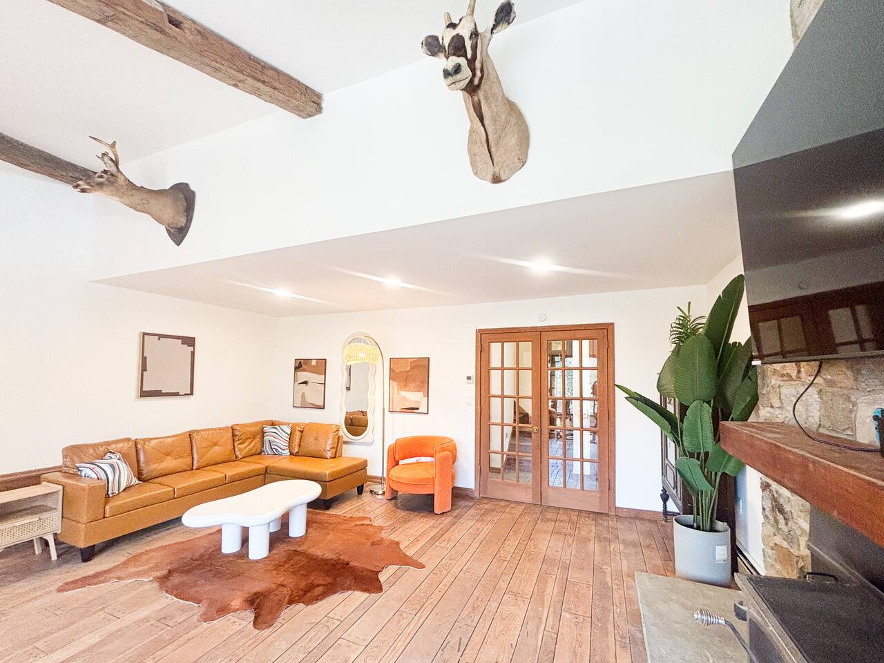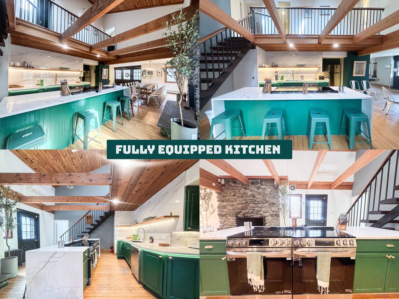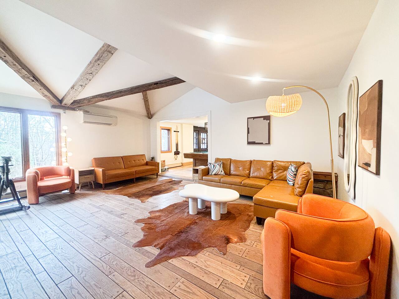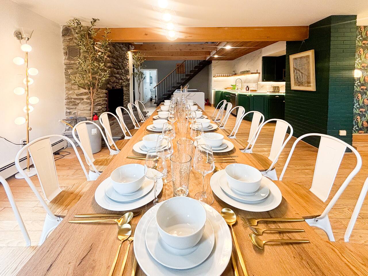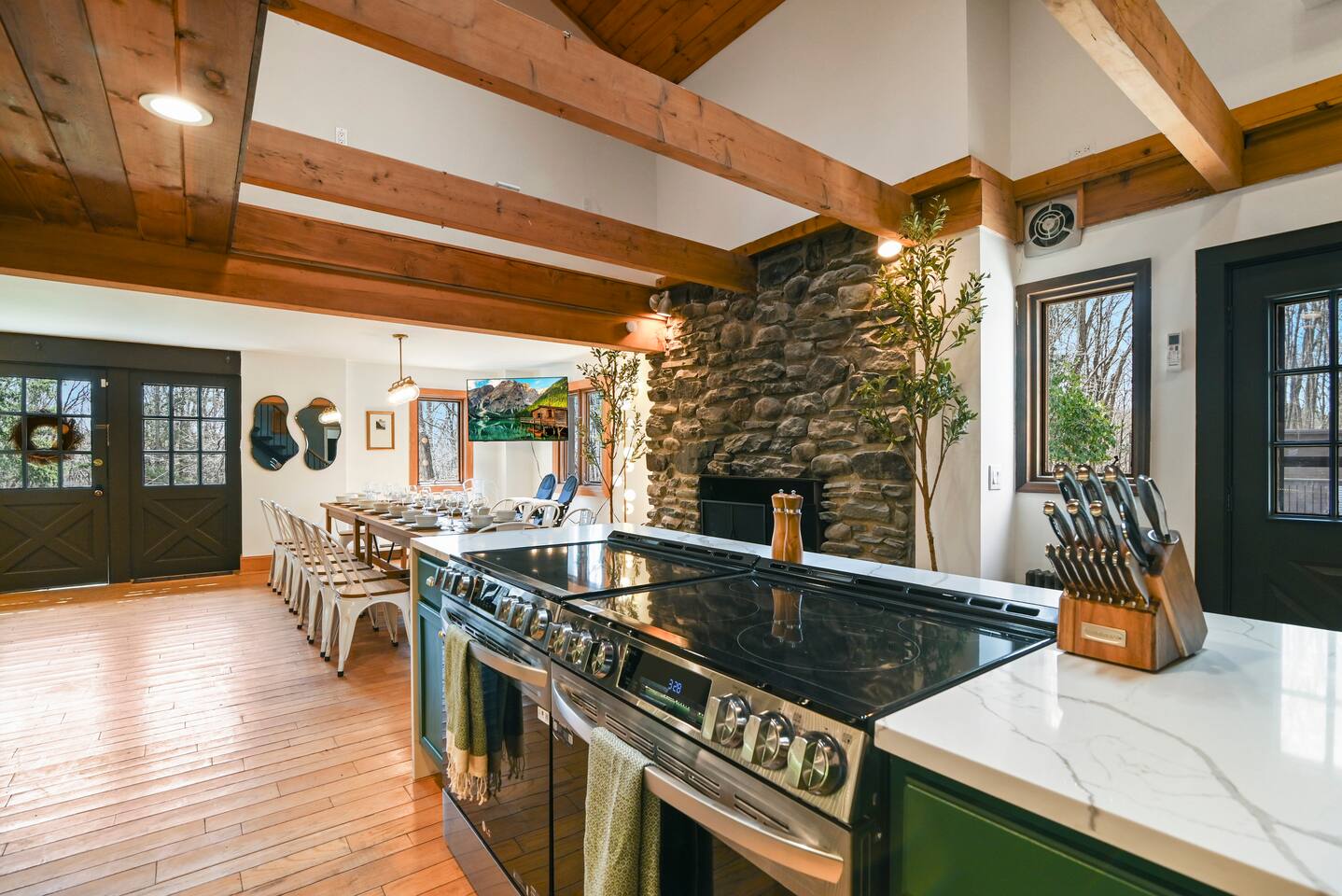 House details [In-ground swimming pool]: POOL IS CLOSED FOR THE SEASON. The outdoor private inground pool measures 20x40 feet and ranges from 3 to 6 feet in depth, offering a perfect space for relaxation and aquatic enjoyment. *Please note it's unheated. The pool will be open between late May to late September. Each year might be slightly different according to the weather. [7 people Sauna]: The sauna, enveloping up to 7 people, is luxuriously enveloped in freshly installed cedar wood paneling and features a powerful 5kW sauna heater, inviting guests to indulge in a relaxing and rejuvenating sweating session. [6 people Hot tub]: The hot tub, featuring 29 jets, provides guests with a comfortable and soothing experience while enjoying the serene view of the surrounding woodlands. [Elevator]: We've installed an elevator connecting the basement to the second floor, ensuring that individuals with disabilities can easily access and enjoy every part of the house. [Pool Table room]: The pool table room boasts a well-decorated ambiance centered around a full-size pool table, offering a sophisticated setting for enjoyable gameplay. It's a refined space tailored for those seeking leisure and social gatherings. [Game room]: The games room is equipped with a foosball table, air hockey, hockey and ring toss games, and a 55-inch TV featuring an arcade game console boasting over 10,000 games. It's a haven for entertainment enthusiasts with a variety of classic and modern gaming options. [Bar room]: The bar room features a beautifully decorated ambiance with a 6-foot-long black quartz countertop, accompanied by bar stools and an oversized sink. Equipped with a 60-inch TV, it accommodates up to 8 people for gambling while enjoying cocktails and watching TV simultaneously. [Movie theater] situated on the basement level, boasts a 120" screen, HD projector, and a professional speaker system, creating an immersive entertainment experience. With five luxurious reclining seats, it's the perfect space for enjoying movies or singing karaoke with friends and family. [Kitchen] is fully stocked for all cooking needs. We offer pots, pans, mixing bowls, cutting board, plates, cutlery and various glasses. Small appliances available are toaster, coffee maker, electric kettle, blender [Dining room] Seats 20 people. Has 60" smart TV. Gas fireplace would add cozy feeling to your evening [Family room]: The family room is furnished with a large leather sectional sofa, a coach, two armchairs, and an inviting egg hanging chair around a coffee table. A focal point is the spacious 75" HD smart TV, complete with party games, perfect for entertaining large groups. [Laundry room]: Contains of 2 washers and 2 dryers [Bedroom] 1st floor Bedroom 1 [1 King bed] Bedroom 2 [1 King bed] 2nd floor Bedroom 3 [2 King beds] Bedroom 4 [1 King bed] Bedroom 5 [1 King bed] Bedroom 6 [1 Queen bed + 1 bunk bed] Bedroom 7 [2 Queen beds] [Bathroom:] 1st floor Bathroom 1: Half bath Bathroom 2: Full bath Unattached to bedroom 2nd floor Bathroom 3: Full bath Unattached to bedroom Bathroom 4: In-suit full bath (attached to bedroom 3) Bathroom 5: In-suit full bath (attached to bedroom 7)