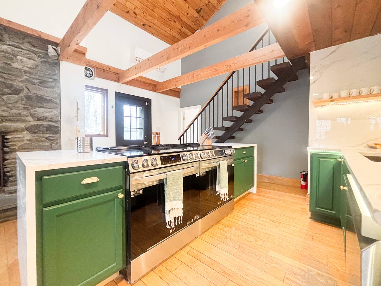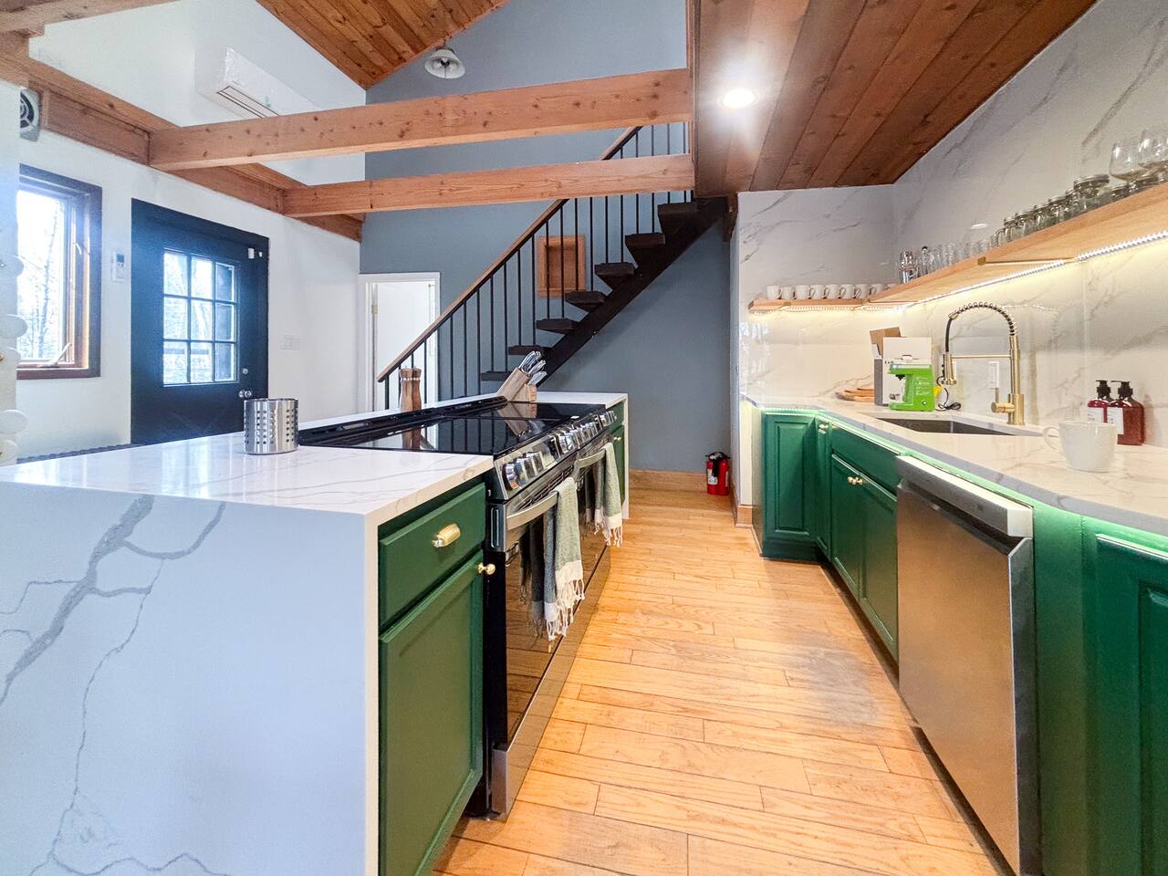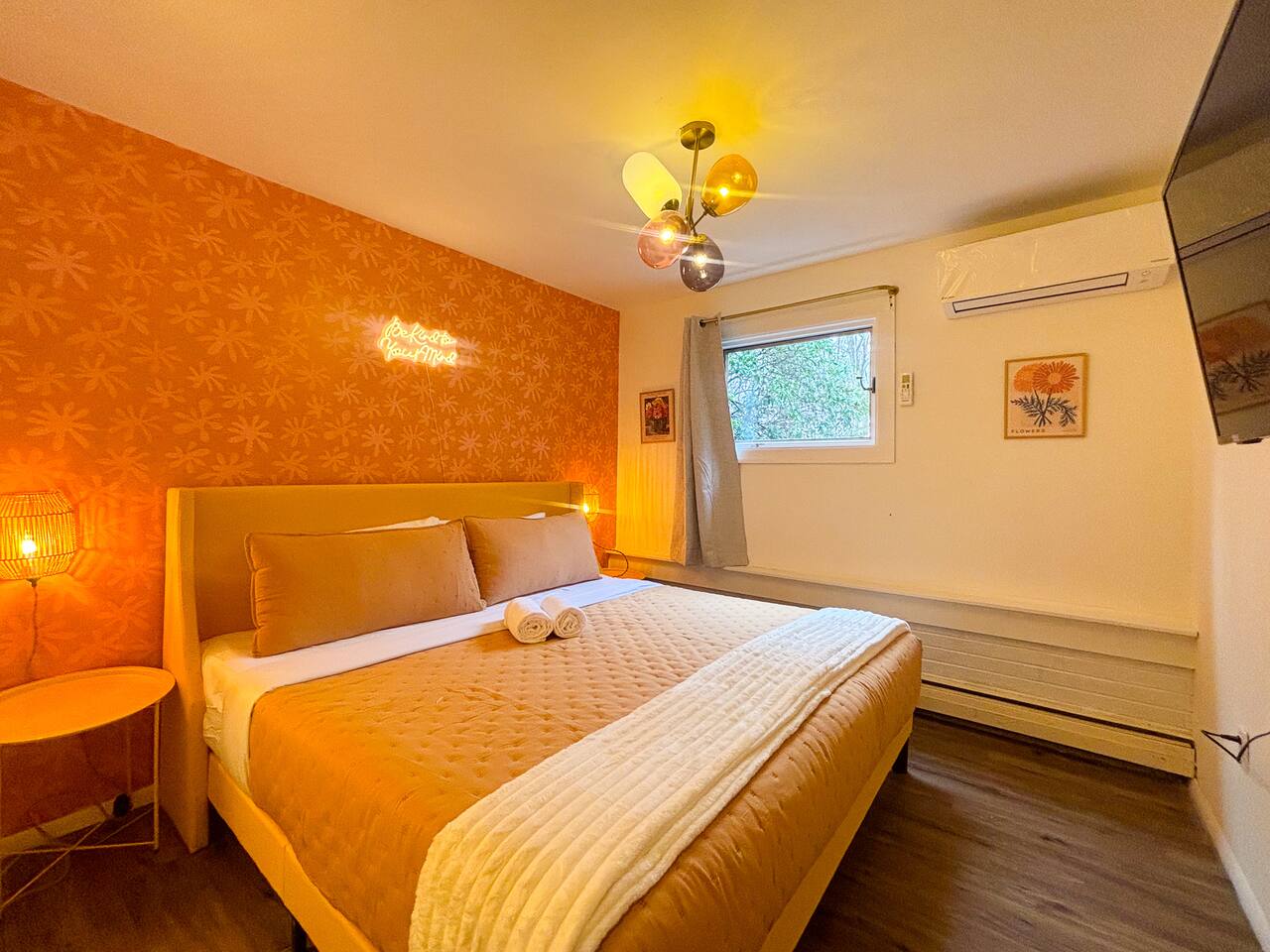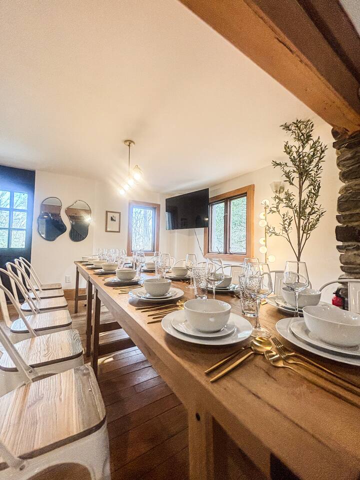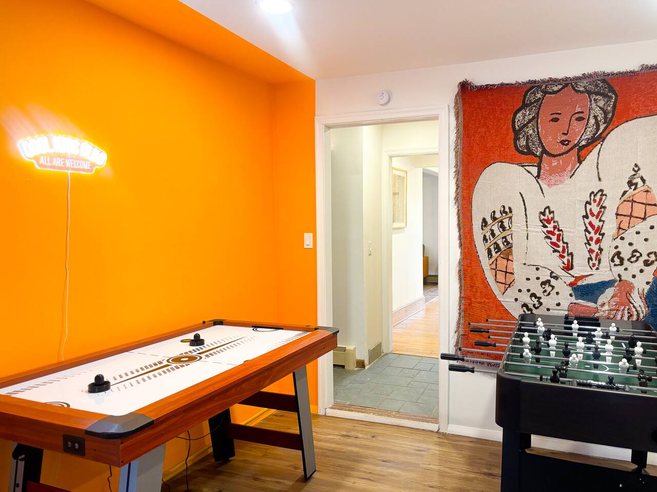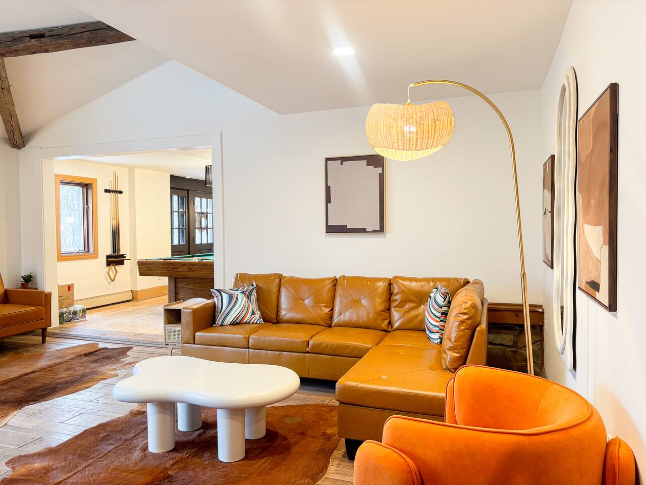 House details [In-ground swimming pool]: POOL IS CLOSED FOR THE SEASON. The outdoor private inground pool measures 20x40 feet and ranges from 3 to 6 feet in depth, offering a perfect space for relaxation and aquatic enjoyment. *Please note it's unheated. The pool will be open between late May to late September. Each year might be slightly different according to the weather. [7 people Sauna]: The sauna, enveloping up to 7 people, is luxuriously enveloped in freshly installed cedar wood paneling and features a powerful 5kW sauna heater, inviting guests to indulge in a relaxing and rejuvenating sweating session. [6 people Hot tub]: The hot tub, featuring 29 jets, provides guests with a comfortable and soothing experience while enjoying the serene view of the surrounding woodlands. [Elevator]: We've installed an elevator connecting the basement to the second floor, ensuring that individuals with disabilities can easily access and enjoy every part of the house. [Pool Table room]: The pool table room boasts a well-decorated ambiance centered around a full-size pool table, offering a sophisticated setting for enjoyable gameplay. It's a refined space tailored for those seeking leisure and social gatherings. [Game room]: The games room is equipped with a foosball table, air hockey, hockey and ring toss games, and a 55-inch TV featuring an arcade game console boasting over 10,000 games. It's a haven for entertainment enthusiasts with a variety of classic and modern gaming options. [Bar room]: The bar room features a beautifully decorated ambiance with a 6-foot-long black quartz countertop, accompanied by bar stools and an oversized sink. Equipped with a 60-inch TV, it accommodates up to 8 people for gambling while enjoying cocktails and watching TV simultaneously. [Movie theater] situated on the basement level, boasts a 120" screen, HD projector, and a professional speaker system, creating an immersive entertainment experience. With five luxurious reclining seats, it's the perfect space for enjoying movies or singing karaoke with friends and family. [Kitchen] is fully stocked for all cooking needs. We offer pots, pans, mixing bowls, cutting board, plates, cutlery and various glasses. Small appliances available are toaster, coffee maker, electric kettle, blender [Dining room] Seats 20 people. Has 60" smart TV. Gas fireplace would add cozy feeling to your evening [Family room]: The family room is furnished with a large leather sectional sofa, a coach, two armchairs, and an inviting egg hanging chair around a coffee table. A focal point is the spacious 75" HD smart TV, complete with party games, perfect for entertaining large groups. [Laundry room]: Contains of 2 washers and 2 dryers [Bedroom] 1st floor Bedroom 1 [1 King bed] Bedroom 2 [1 King bed] 2nd floor Bedroom 3 [2 King beds] Bedroom 4 [1 King bed] Bedroom 5 [1 King bed] Bedroom 6 [1 Queen bed + 1 bunk bed] Bedroom 7 [2 Queen beds] [Bathroom:] 1st floor Bathroom 1: Half bath Bathroom 2: Full bath Unattached to bedroom 2nd floor Bathroom 3: Full bath Unattached to bedroom Bathroom 4: In-suit full bath (attached to bedroom 3) Bathroom 5: In-suit full bath (attached to bedroom 7)