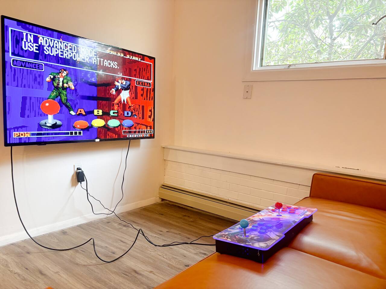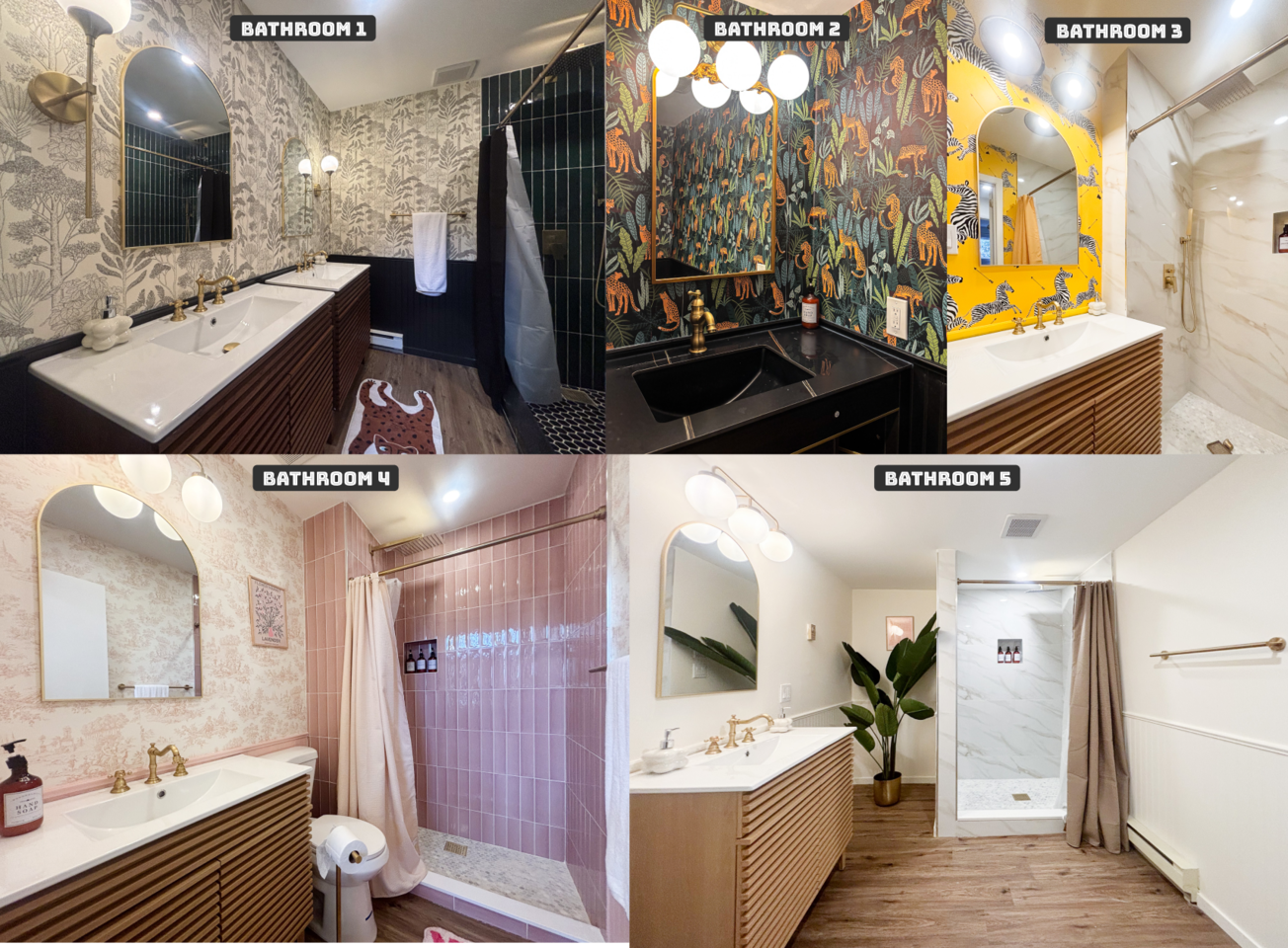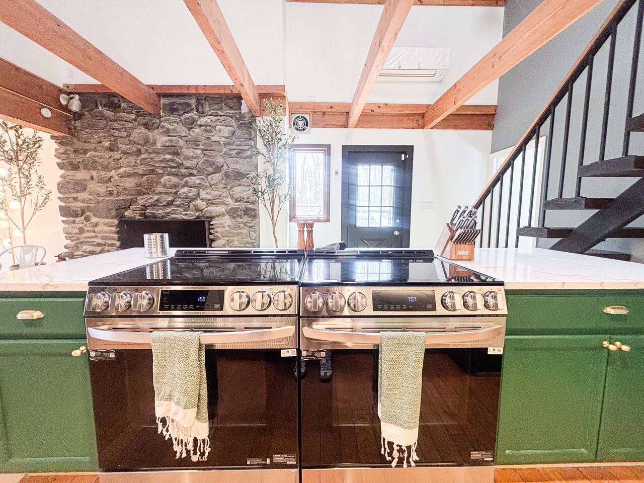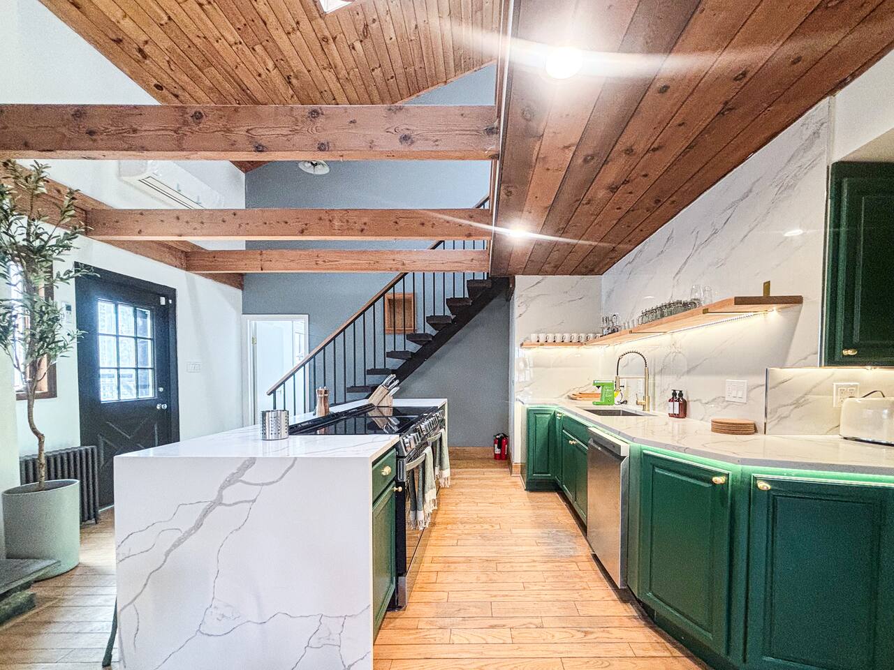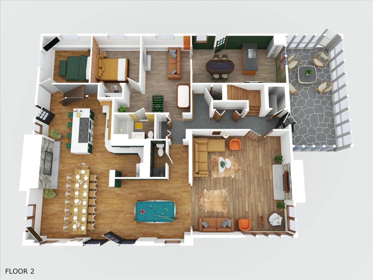House details [In-ground swimming pool]: POOL IS CLOSED FOR THE SEASON. The outdoor private inground pool measures 20x40 feet and ranges from 3 to 6 feet in depth, offering a perfect space for relaxation and aquatic enjoyment. *Please note it's unheated. The pool will be open between late May to late September. Each year might be slightly different according to the weather. [7 people Sauna]: The sauna, enveloping up to 7 people, is luxuriously enveloped in freshly installed cedar wood paneling and features a powerful 5kW sauna heater, inviting guests to indulge in a relaxing and rejuvenating sweating session. [6 people Hot tub]: The hot tub, featuring 29 jets, provides guests with a comfortable and soothing experience while enjoying the serene view of the surrounding woodlands. [Elevator]: We've installed an elevator connecting the basement to the second floor, ensuring that individuals with disabilities can easily access and enjoy every part of the house. [Pool Table room]: The pool table room boasts a well-decorated ambiance centered around a full-size pool table, offering a sophisticated setting for enjoyable gameplay. It's a refined space tailored for those seeking leisure and social gatherings. [Game room]: The games room is equipped with a foosball table, air hockey, hockey and ring toss games, and a 55-inch TV featuring an arcade game console boasting over 10,000 games. It's a haven for entertainment enthusiasts with a variety of classic and modern gaming options. [Bar room]: The bar room features a beautifully decorated ambiance with a 6-foot-long black quartz countertop, accompanied by bar stools and an oversized sink. Equipped with a 60-inch TV, it accommodates up to 8 people for gambling while enjoying cocktails and watching TV simultaneously. [Movie theater] situated on the basement level, boasts a 120" screen, HD projector, and a professional speaker system, creating an immersive entertainment experience. With five luxurious reclining seats, it's the perfect space for enjoying movies or singing karaoke with friends and family. [Kitchen] is fully stocked for all cooking needs. We offer pots, pans, mixing bowls, cutting board, plates, cutlery and various glasses. Small appliances available are toaster, coffee maker, electric kettle, blender [Dining room] Seats 20 people. Has 60" smart TV. Gas fireplace would add cozy feeling to your evening [Family room]: The family room is furnished with a large leather sectional sofa, a coach, two armchairs, and an inviting egg hanging chair around a coffee table. A focal point is the spacious 75" HD smart TV, complete with party games, perfect for entertaining large groups. [Laundry room]: Contains of 2 washers and 2 dryers [Bedroom] 1st floor Bedroom 1 [1 King bed] Bedroom 2 [1 King bed] 2nd floor Bedroom 3 [2 King beds] Bedroom 4 [1 King bed] Bedroom 5 [1 King bed] Bedroom 6 [1 Queen bed + 1 bunk bed] Bedroom 7 [2 Queen beds] [Bathroom:] 1st floor Bathroom 1: Half bath Bathroom 2: Full bath Unattached to bedroom 2nd floor Bathroom 3: Full bath Unattached to bedroom Bathroom 4: In-suit full bath (attached to bedroom 3) Bathroom 5: In-suit full bath (attached to bedroom 7)