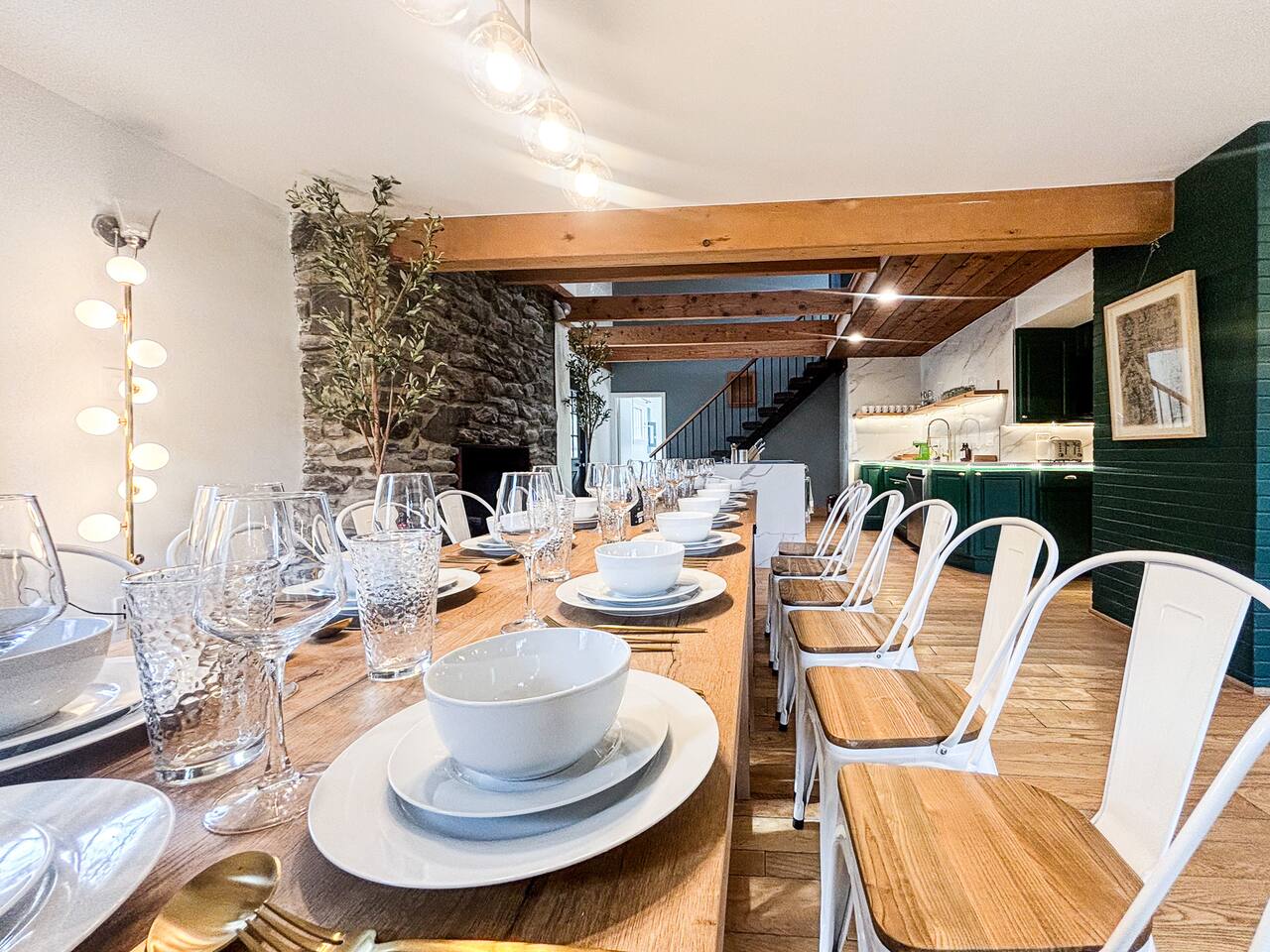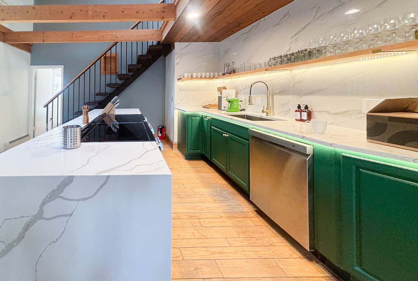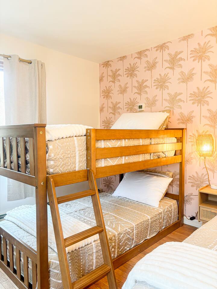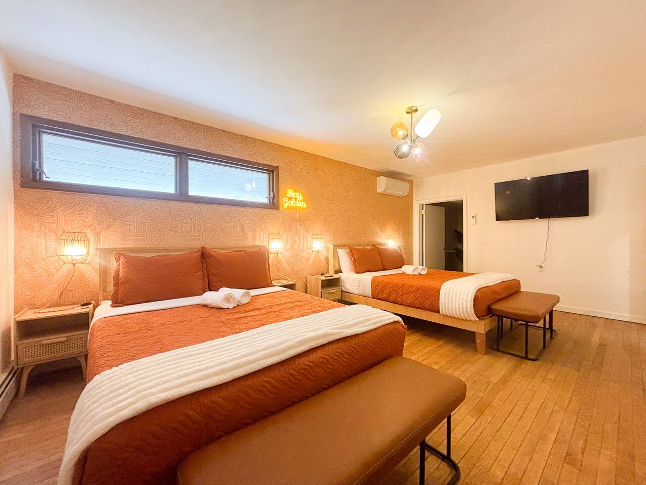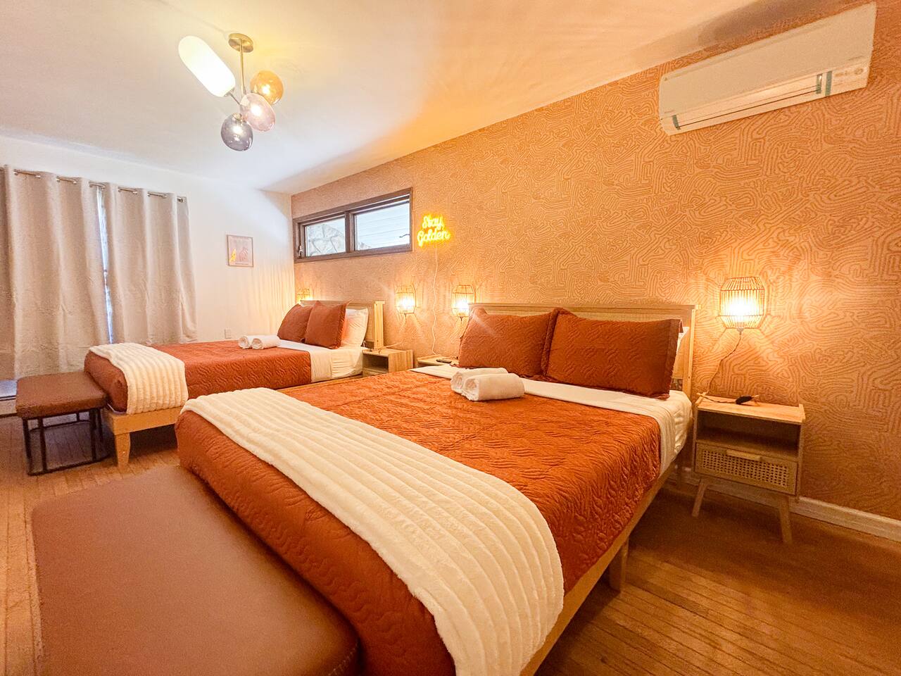 House details [In-ground swimming pool]: POOL IS CLOSED FOR THE SEASON. The outdoor private inground pool measures 20x40 feet and ranges from 3 to 6 feet in depth, offering a perfect space for relaxation and aquatic enjoyment. *Please note it's unheated. The pool will be open between late May to late September. Each year might be slightly different according to the weather. [7 people Sauna]: The sauna, enveloping up to 7 people, is luxuriously enveloped in freshly installed cedar wood paneling and features a powerful 5kW sauna heater, inviting guests to indulge in a relaxing and rejuvenating sweating session. [6 people Hot tub]: The hot tub, featuring 29 jets, provides guests with a comfortable and soothing experience while enjoying the serene view of the surrounding woodlands. [Elevator]: We've installed an elevator connecting the basement to the second floor, ensuring that individuals with disabilities can easily access and enjoy every part of the house. [Pool Table room]: The pool table room boasts a well-decorated ambiance centered around a full-size pool table, offering a sophisticated setting for enjoyable gameplay. It's a refined space tailored for those seeking leisure and social gatherings. [Game room]: The games room is equipped with a foosball table, air hockey, hockey and ring toss games, and a 55-inch TV featuring an arcade game console boasting over 10,000 games. It's a haven for entertainment enthusiasts with a variety of classic and modern gaming options. [Bar room]: The bar room features a beautifully decorated ambiance with a 6-foot-long black quartz countertop, accompanied by bar stools and an oversized sink. Equipped with a 60-inch TV, it accommodates up to 8 people for gambling while enjoying cocktails and watching TV simultaneously. [Movie theater] situated on the basement level, boasts a 120" screen, HD projector, and a professional speaker system, creating an immersive entertainment experience. With five luxurious reclining seats, it's the perfect space for enjoying movies or singing karaoke with friends and family. [Kitchen] is fully stocked for all cooking needs. We offer pots, pans, mixing bowls, cutting board, plates, cutlery and various glasses. Small appliances available are toaster, coffee maker, electric kettle, blender [Dining room] Seats 20 people. Has 60" smart TV. Gas fireplace would add cozy feeling to your evening [Family room]: The family room is furnished with a large leather sectional sofa, a coach, two armchairs, and an inviting egg hanging chair around a coffee table. A focal point is the spacious 75" HD smart TV, complete with party games, perfect for entertaining large groups. [Laundry room]: Contains of 2 washers and 2 dryers [Bedroom] 1st floor Bedroom 1 [1 King bed] Bedroom 2 [1 King bed] 2nd floor Bedroom 3 [2 King beds] Bedroom 4 [1 King bed] Bedroom 5 [1 King bed] Bedroom 6 [1 Queen bed + 1 bunk bed] Bedroom 7 [2 Queen beds] [Bathroom:] 1st floor Bathroom 1: Half bath Bathroom 2: Full bath Unattached to bedroom 2nd floor Bathroom 3: Full bath Unattached to bedroom Bathroom 4: In-suit full bath (attached to bedroom 3) Bathroom 5: In-suit full bath (attached to bedroom 7)